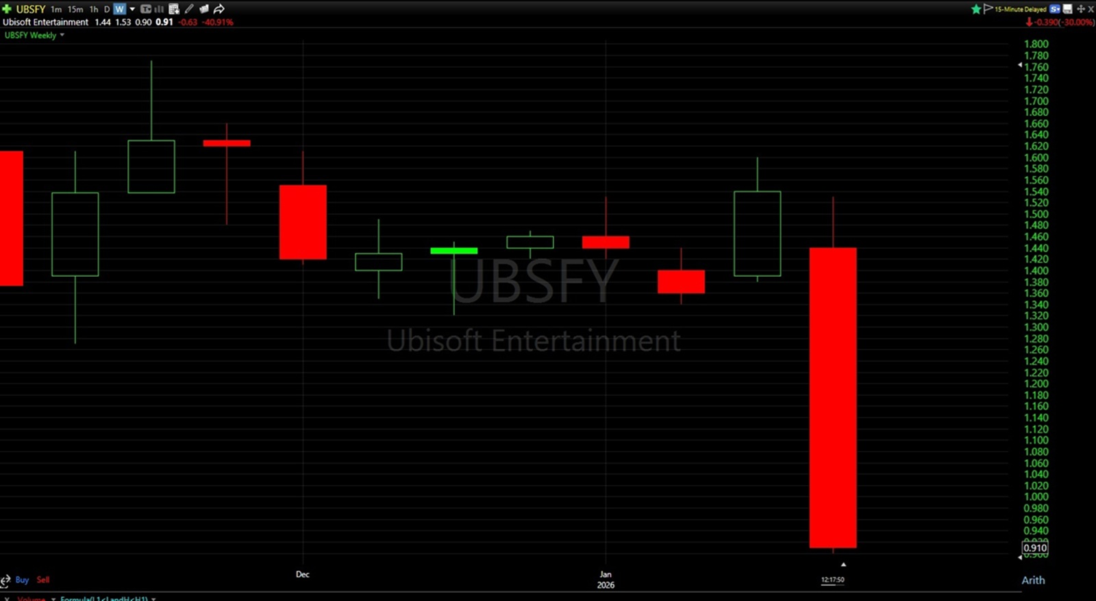 После объявления об реорганизации Ubisoft 21 января, её акции (UBSFY) изначально испытали лишь небольшое снижение. Однако, полное влияние ощутилось только 22 января, когда цена акций рухнула примерно на 30 процентов, упав с $1.30 до $0.92 за акцию к моменту открытия рынка в четверг.