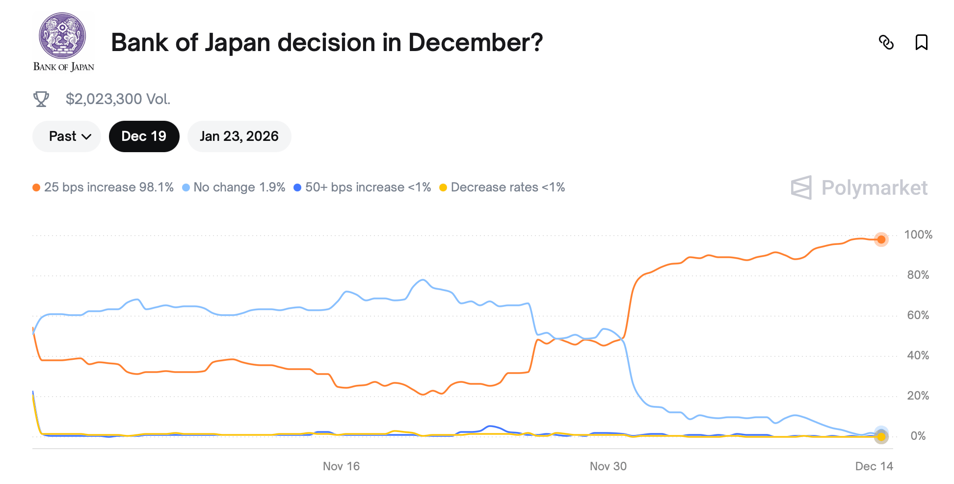 Федеральная резервная система, всегда любящая драму, только что снизила свои ставки на четверть пункта, и теперь рынки делают ставку на то, что заседание ФОМК в январе не принесет никаких корректировок. Внимание теперь переключилось на Банк Японии, где растут ожидания, что центральный банк повысит свою краткосрочную межбанковскую ставку на следующей неделе. 🤝