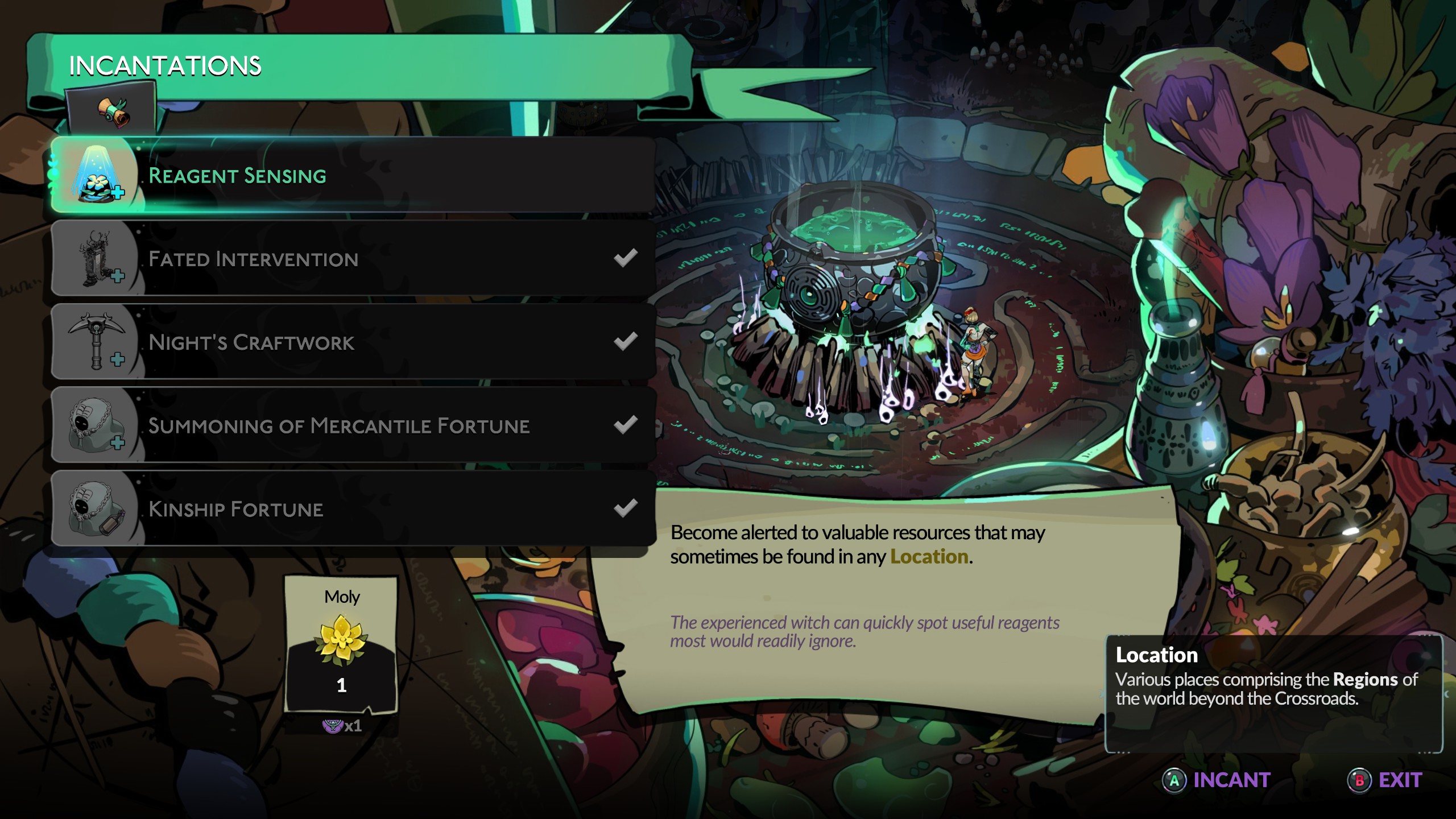 Чтобы использовать Котел, просто подойдите к нему и нажмите кнопку взаимодействия. Когда вы посмотрите на список Заклинаний, вы увидите, какие материалы требуются для каждого из них. Если у вас есть эти материалы, вы можете открыть Заклинание, чтобы получить его преимущества. Эти преимущества могут включать открытие новых торговцев, улучшение ассортимента существующих торговцев или позволить вам получить Аспекты, которые улучшают ваше оружие.