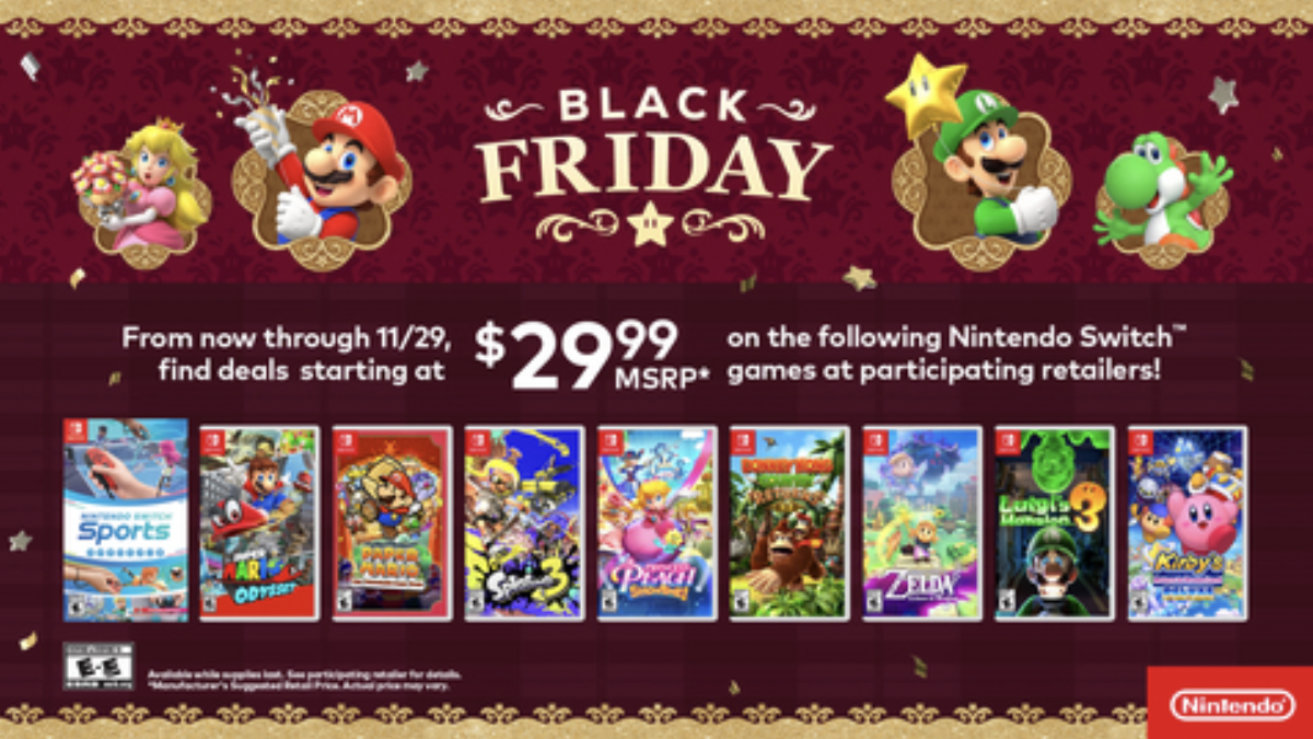 С 23 ноября 2025 года Nintendo будет предлагать девять своих популярных игр для Switch по сниженной цене в «Черную пятницу» и «Киберпонедельник». Эти игры будут доступны по цене 29,99 или 39,99 долларов США. В число игр стоимостью 29,99 доллара входят Nintendo Switch Sports, Paper Mario: The Thousand Year Door, Splatoon 3 и Super Mario Odyssey. Игры стоимостью 39,99 доллара — это Donkey Kong Country Returns HD, Kirby’s Return to Dream Land Deluxe, The Legend of Zelda: Echoes of Wisdom, Luigi’s Mansion 3 и Princess Peach: Showtime.