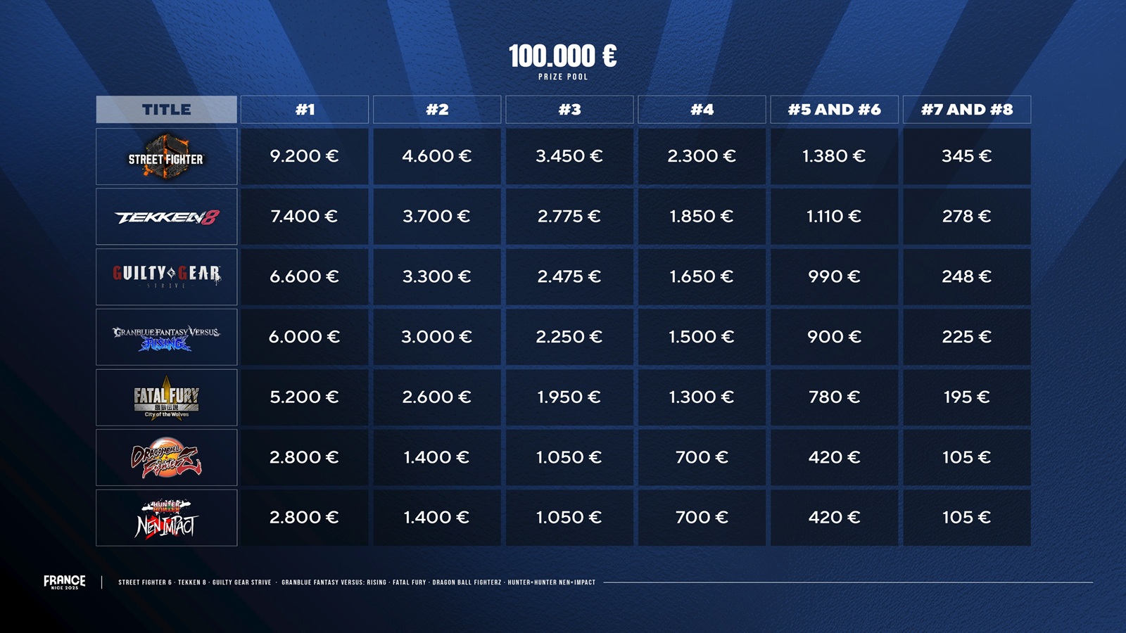 Я очень рад предстоящей EVO! Ожидаю, что Top 8 будет заполнен невероятными игроками. Это первое подобное мероприятие для EVO, и все будут упорно бороться, чтобы войти в историю и попасть в финал. Если им это удастся, EVO France поделилась всеми подробностями о том, какие призы игроки могут выиграть в зависимости от их места.