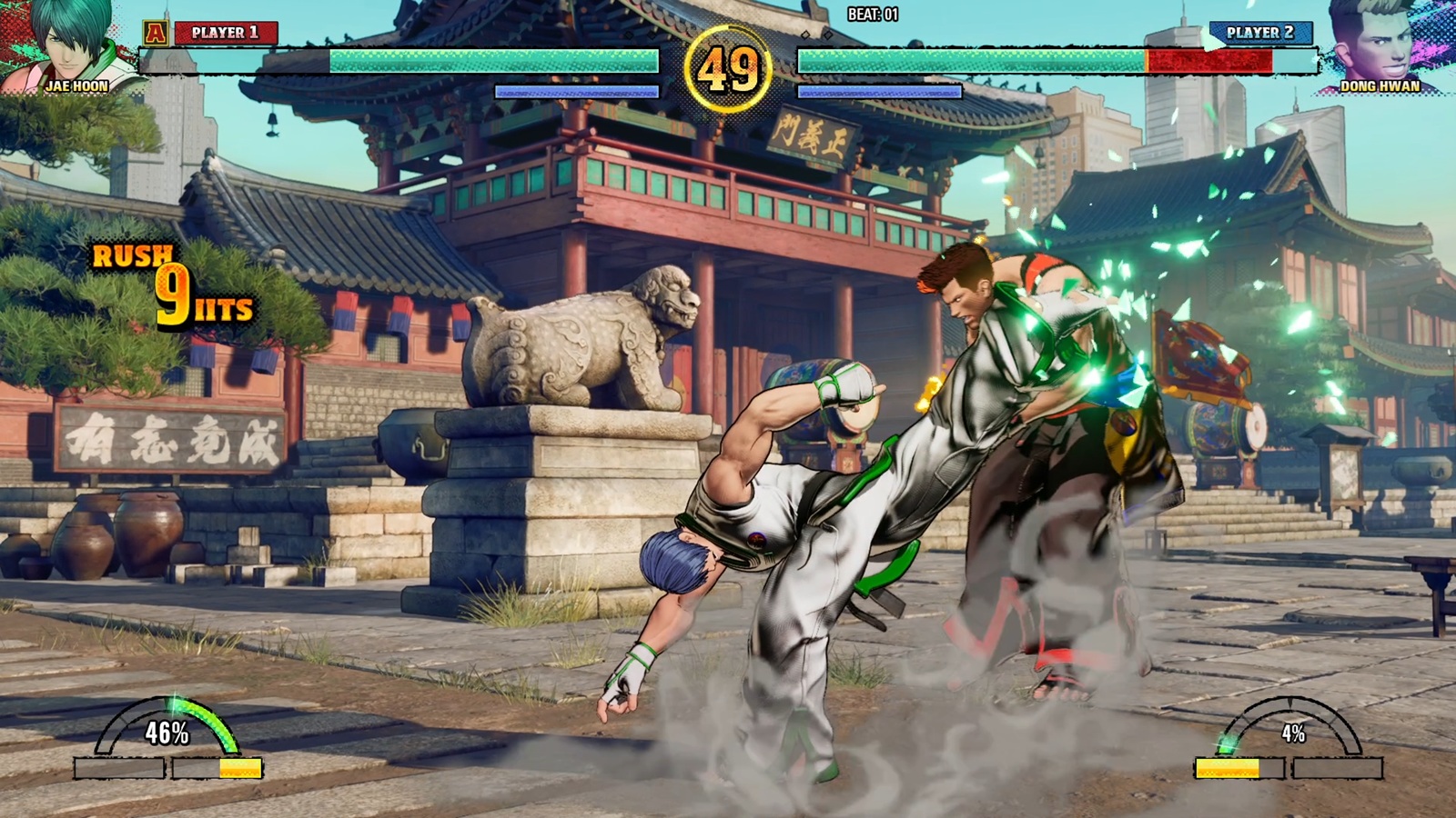 В целом, меня не очень впечатлили стандартные атаки Дже Хун, за исключением пары из них. Основная проблема в том, что ему трудно продолжать комбо после использования многих его атак с большей дальностью. Ведя бой на расстоянии, ему необходимо применить специальный прием или воспользоваться ошибкой противника, чтобы начать комбо. Мне нравится его приседающий Сильный Удар, потому что это одна из немногих атак с большой дальностью, которая может плавно переходить в его последовательности комбо. Это действительно единственное базовое нажатие кнопки на Дже Хуне, которое позволяет выполнять комбо на хорошем расстоянии. У него есть крутой командный нормал – отступ назад, за которым следует вперед Легкий Удар – который позволяет ему бросаться вперед для удара, который также входит в комбо. Однако противники могут парировать этот удар, если предвидят его, поэтому лучше использовать его экономно и только тогда, когда вы думаете, что он достигнет цели.