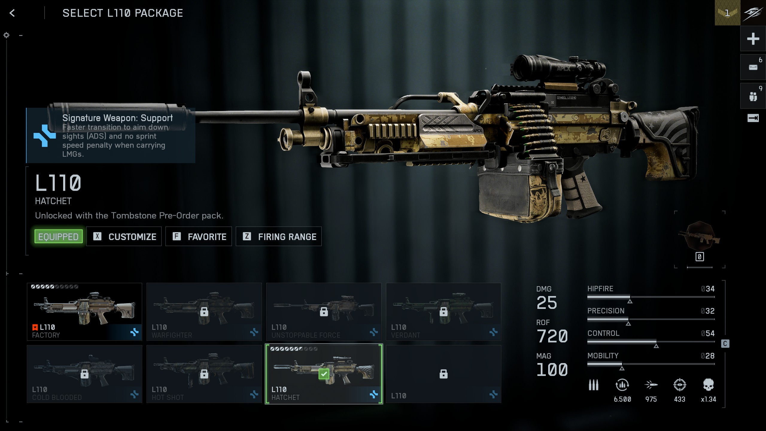 - На этом экране вы можете выбрать скин (например, Топор для L110 LMG)