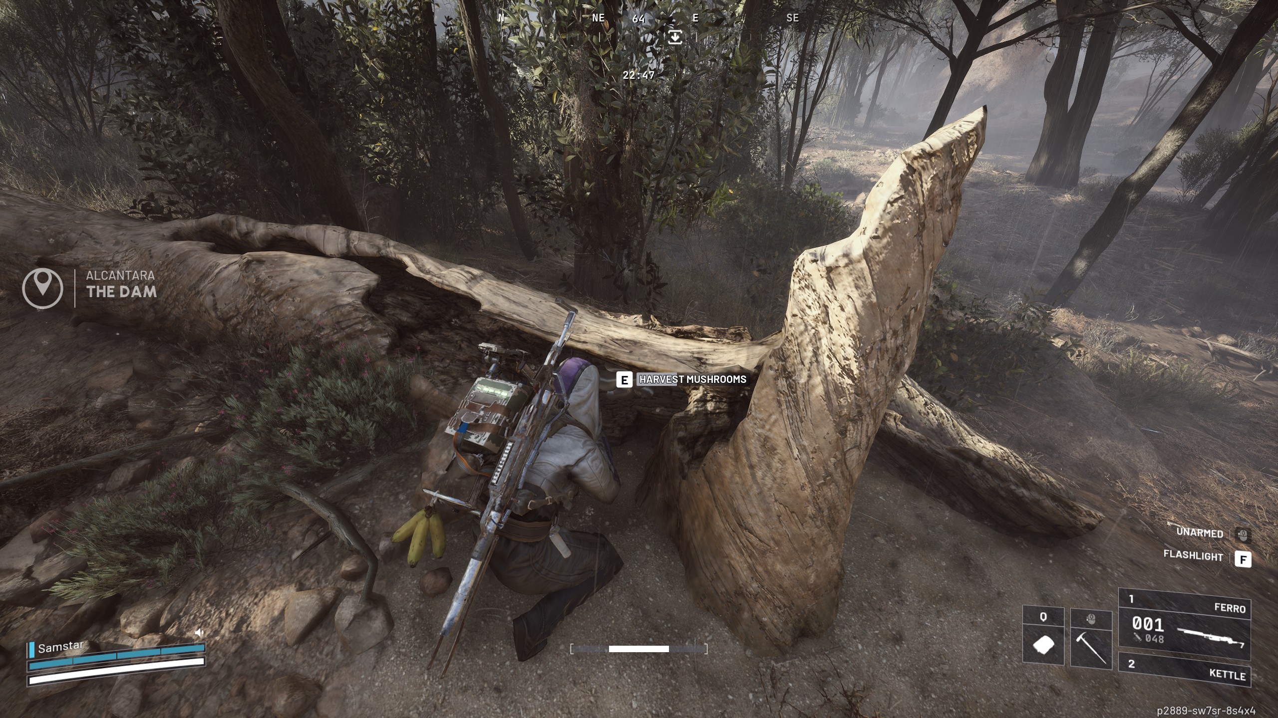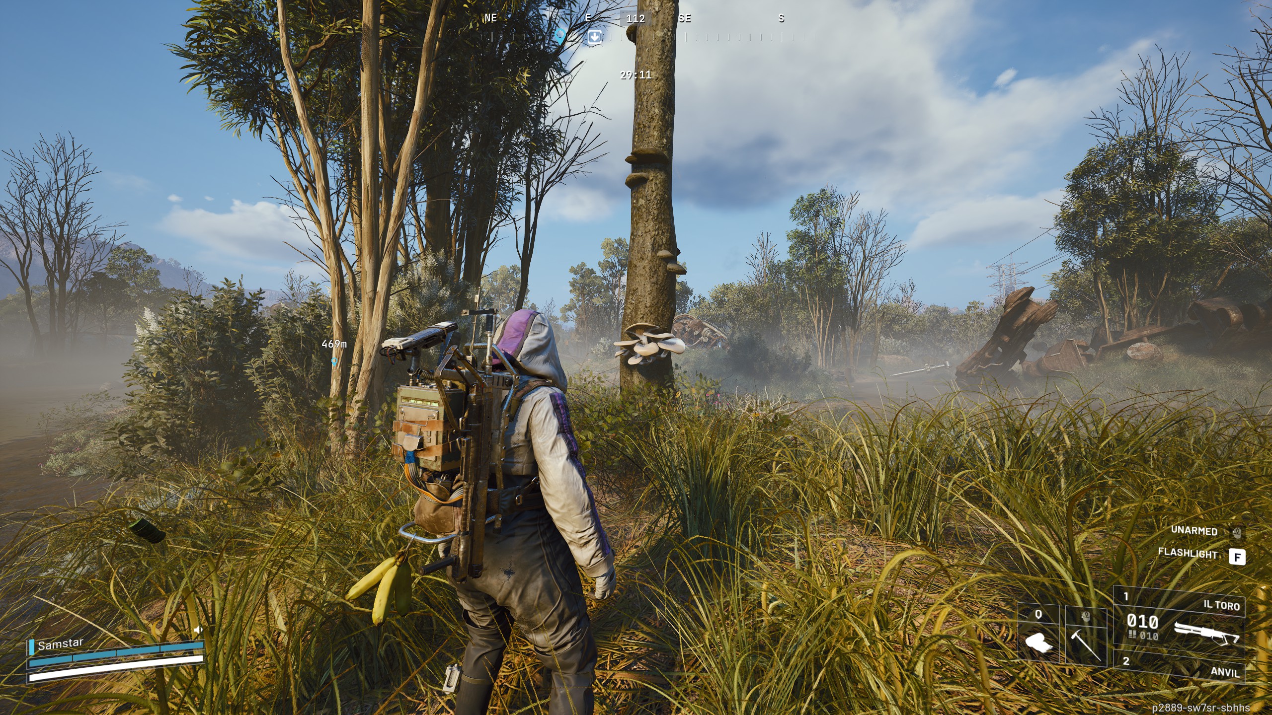 Окей, значит, я охочусь за этими скоплениями белых грибов. Я узнал, что только потому, что на дереве кажется, что есть грибы, не означает, что я могу их собрать. Хитрость в том, чтобы подбегать к каждому дереву и внимательно смотреть – появится маленькая белая окружность, если рядом есть место для сбора урожая. Это немного похоже на поиски сокровищ, но именно так я их и нахожу!