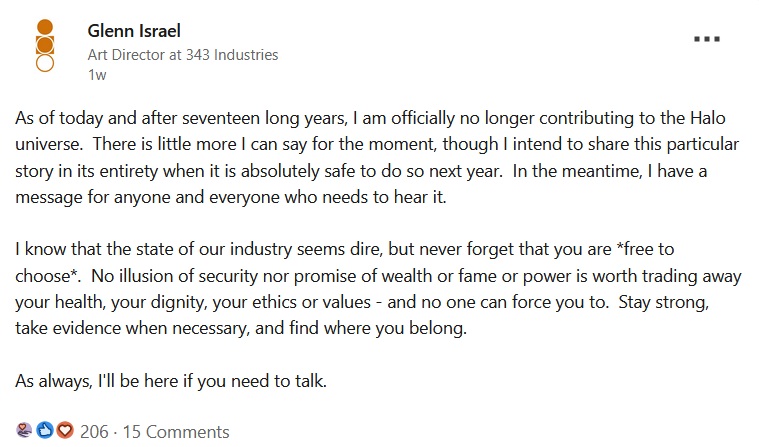 Израиль объявил о своем уходе из 343 Industries в LinkedIn. В своем посте он намекнул, что его уход был не совсем дружелюбным, предполагая наличие неких скрытых проблем в компании.