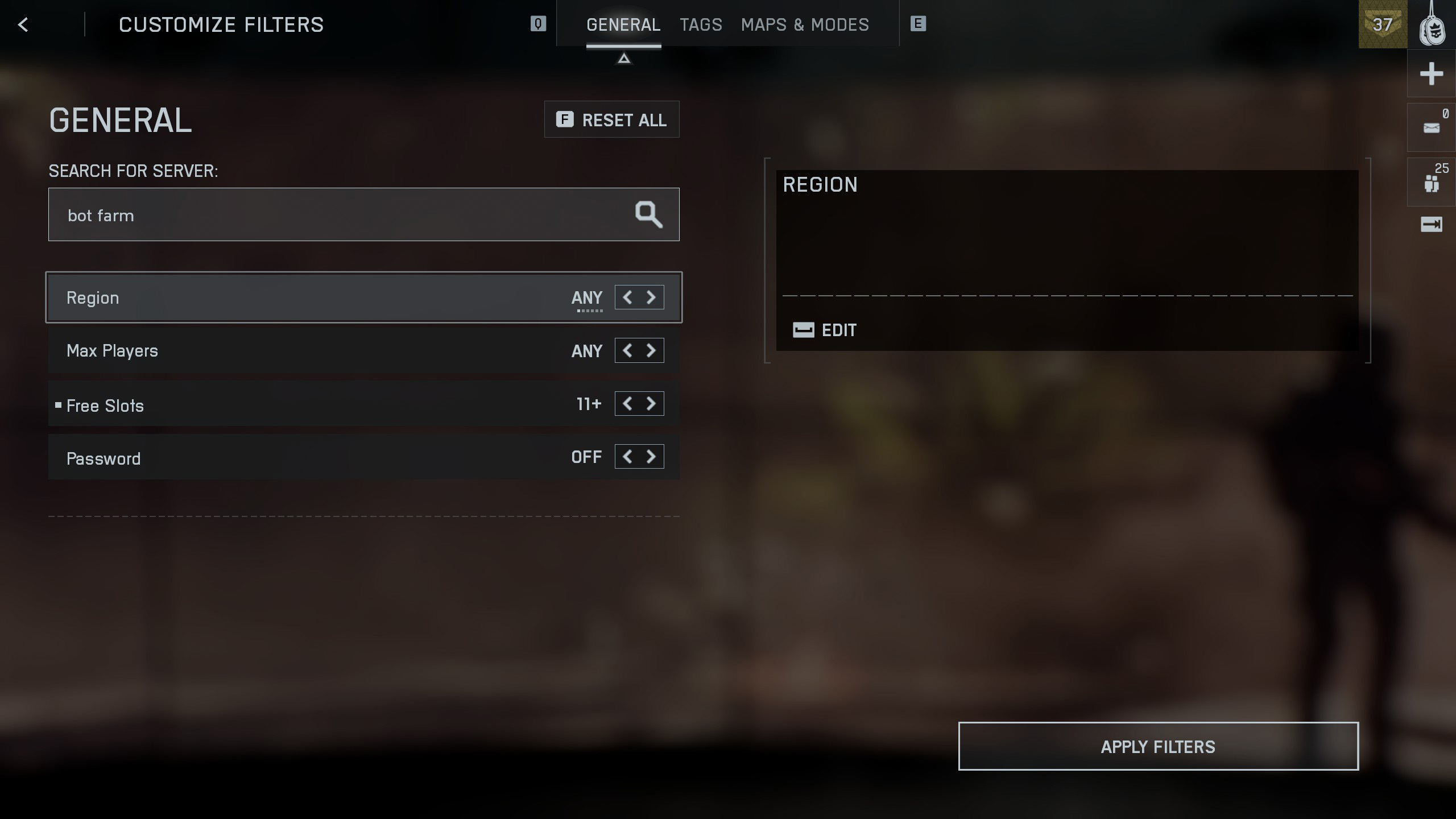 Чтобы найти ферму ботов, откройте браузер серверов и нажмите на ‘Filters’. Затем введите ‘bot farm’ в строку поиска – вы увидите много серверов, предназначенных для быстрого получения опыта. Но не все эти серверы хороши, поэтому вот что следует учитывать при выборе одного для использования: