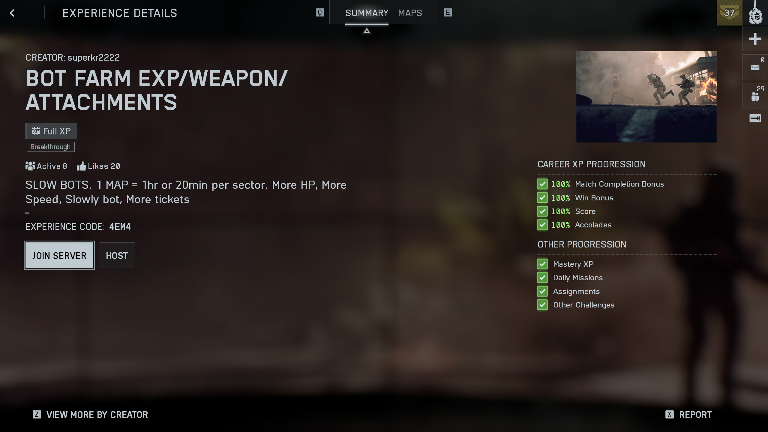 Окей, так что если вы ищете действительно популярное место для фарма опыта, есть этот код – 7AUR – который бросает вас в матч Breakthrough с 63 ботами! Это потрясающе, если вы просто хотите всё перемалывать в одиночку, но честно говоря, я обнаружил, что играть с парой друзей намного веселее. Это делает процесс менее скучным и очень помогает, когда вам нужен кто-то, чтобы пополнить ваши запасы или вылечить вас во время матча.