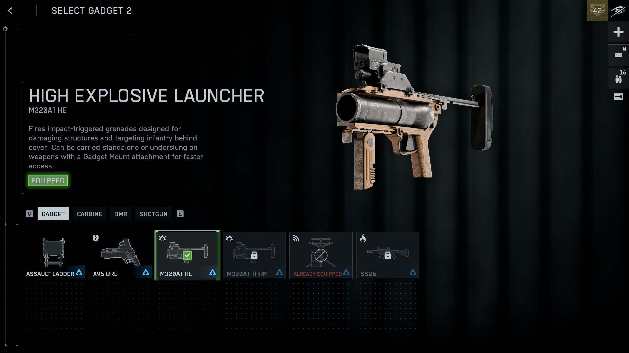 Чтобы использовать гранатомёт с вашей штурмовой винтовкой, сначала прикрепите нижнее крепление. Затем убедитесь, что в слоте для гаджетов установлен гранатомёт M320A1 HE, M320A1 THRM или M320A1 SMK – крепление не будет работать без одного из них. Во время боя нажмите клавишу ‘4’ или правую кнопку D-pad, чтобы переключиться на нижний гранатомёт.