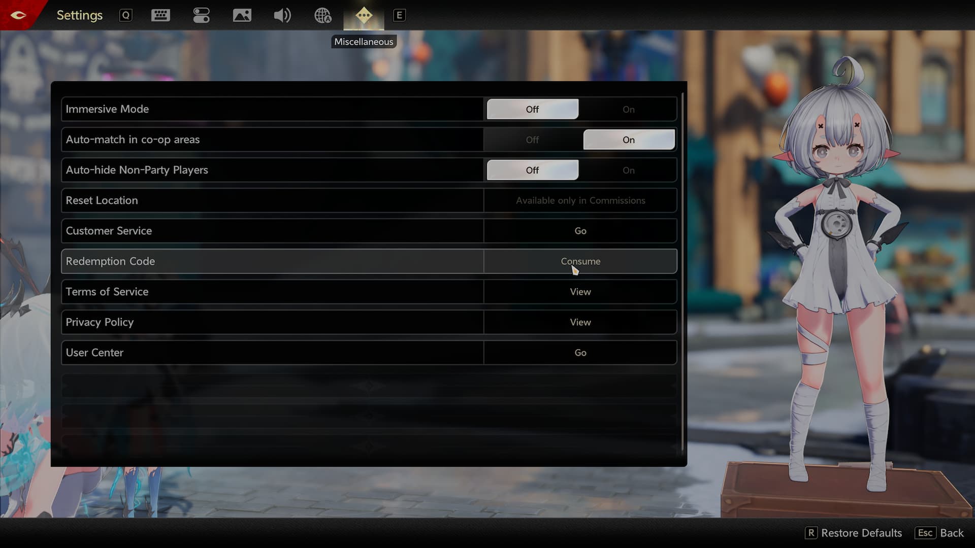 Чтобы использовать код в Duet Night Abyss, начните с главного меню и откройте Настройки. Перейдите в раздел «Разное» — это последняя иконка справа — и выберите «Погашение кода». Введите свой код и нажмите «Погасить». Если код действителен, вы немедленно получите свои награды — вам не нужно проверять свою почту!