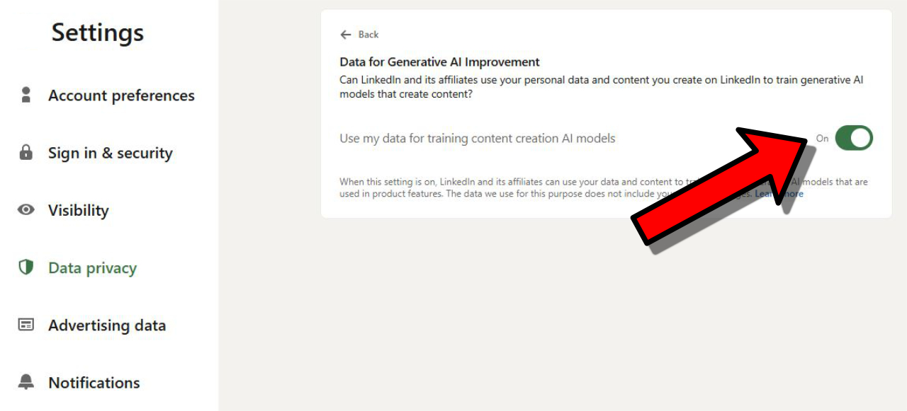 - Переключите переключатель рядом с надписью «Использовать мои данные для обучения моделей ИИ, создающих контент» в положение «выключено».