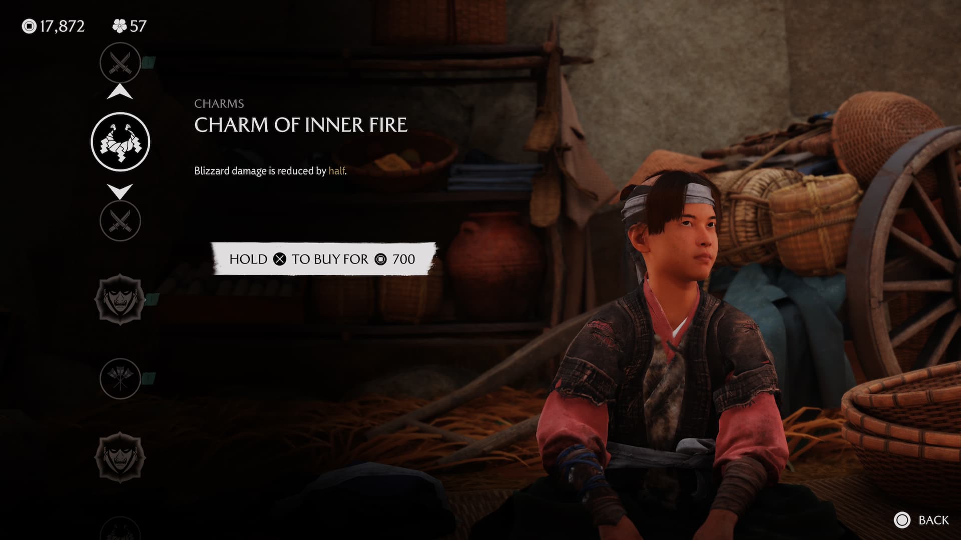 Если у него нет Амулета Внутреннего Пламени, продолжайте играть, пока не начнете квест по поиску Кицунэ в хребте Тешио и не получите Шифр Девяти Хвостов. Это добавит Амулет в список его доступных предметов, что позволит вам купить его у него.