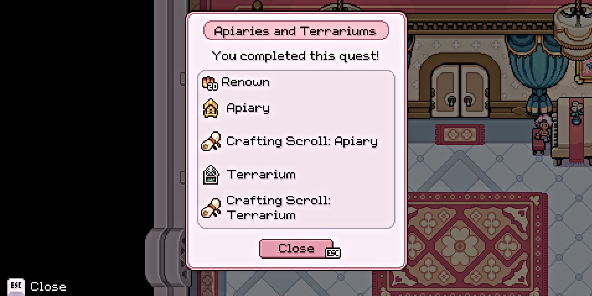 После выполнения этой цели поговорите с Аделиной, чтобы завершить задание. Вы получите хорошее количество Renown, а также бесплатные Apiary и Terrarium для начала. Она также даст вам Crafting Scrolls для обоих, чтобы вы могли создавать больше, когда они вам понадобятся.