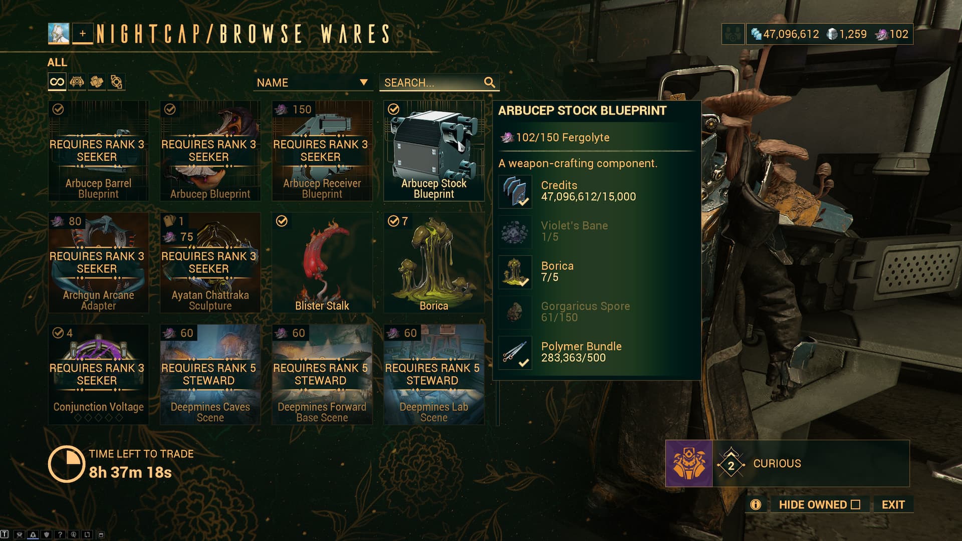 Как фанат Nightcap, я очень рад, что мы можем повысить уровень её Syndicate! Как только мы достигнем Ранга 3, мы сможем начать покупать детали, используя Fergolyte, ресурс, который мы получаем, просто выполняя задания Nightcap – так что чем больше мы ей помогаем, тем больше мы можем получить!