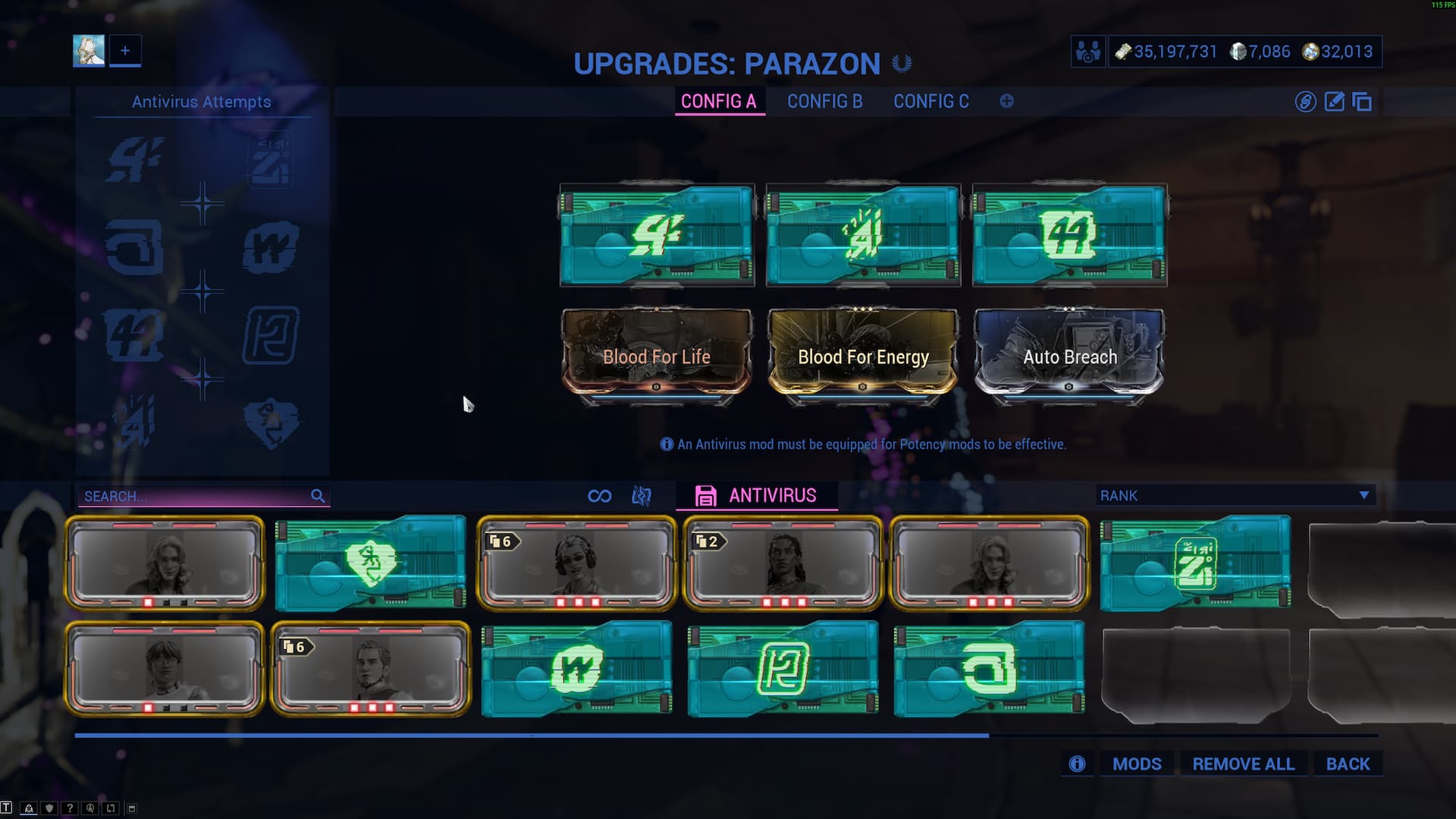 • Все модификации имеют три заряда, будь то Антивирус или Эффективность. Модификации Антивирус теряют заряд при использовании для уничтожения Техноцита Кода во время миссии Земля Проксима, модификации Эффективности теряют заряд при использовании для введения Антивируса в Техноцит Кода во время обычных миссий.