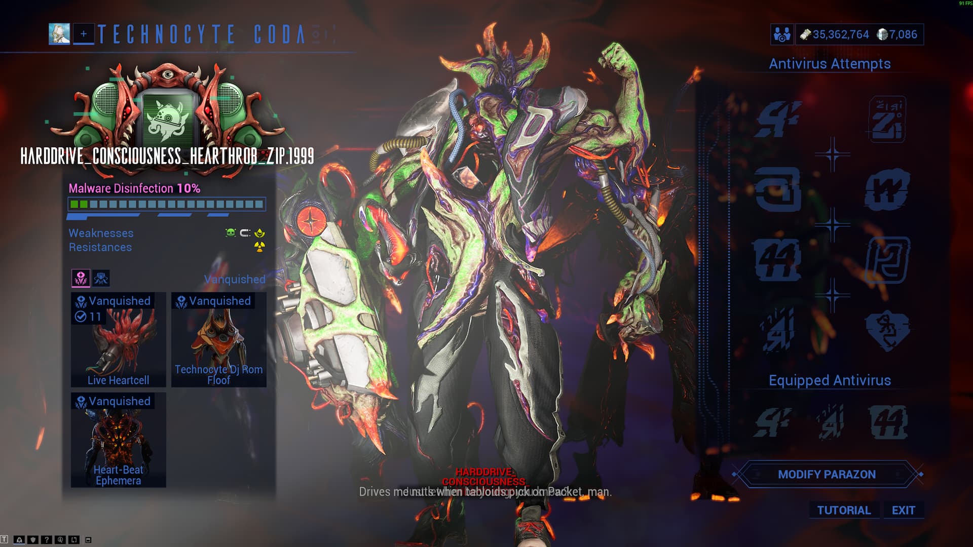 Чтобы победить Техноцита Коду, вам потребуется установить модификации Антивирус в ваш Паразон. Эти модификации помогают ослабить его защиту во время повторных столкновений, постепенно снижая значения на индикаторе Дезинфекции от вредоносного ПО. Вы можете получить эти модификации, выполнив специальное задание, размещенное на доске заданий в гараже торгового центра Холлвания, где вы обычно берете задания. В качестве альтернативы, покупка полного набора модификаций Антивирус на рынке обойдется вам в 100 Платины.
