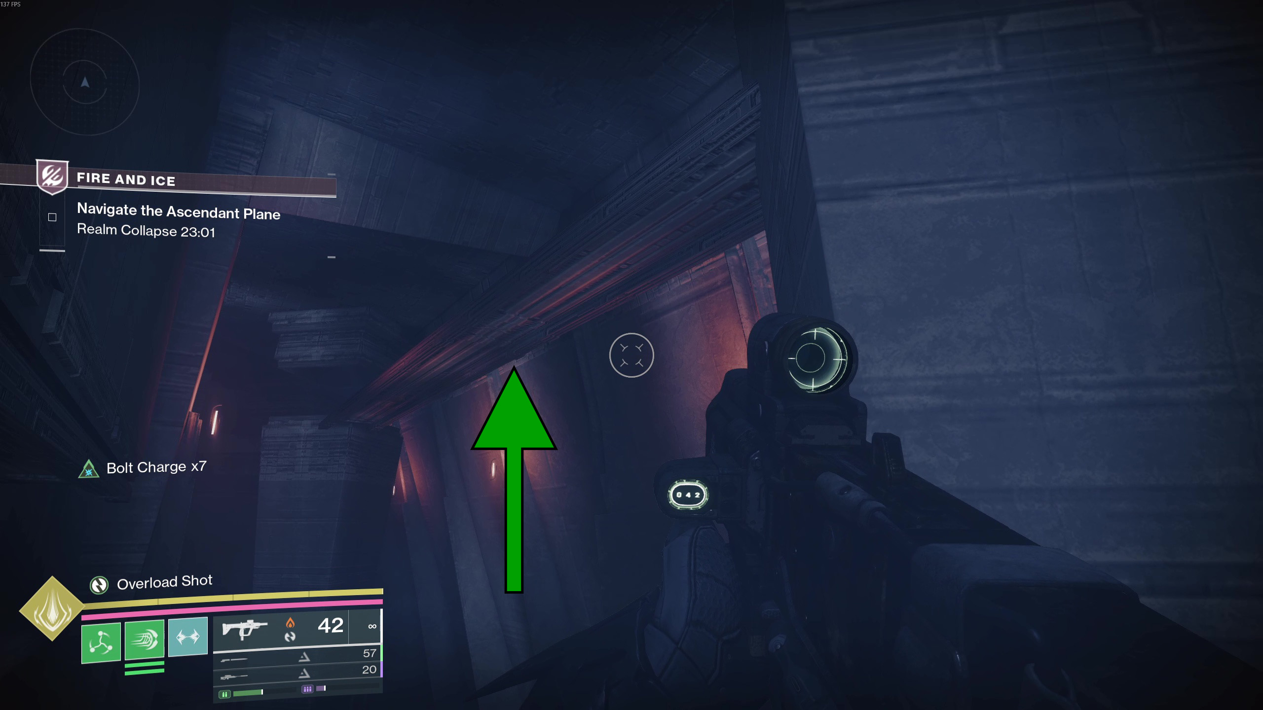 Когда вы доберетесь до области с красными огнями, запрыгните на среднюю перилу и взгляните направо. Вскоре вы заметите более высокую платформу, на которую можно прыгнуть.