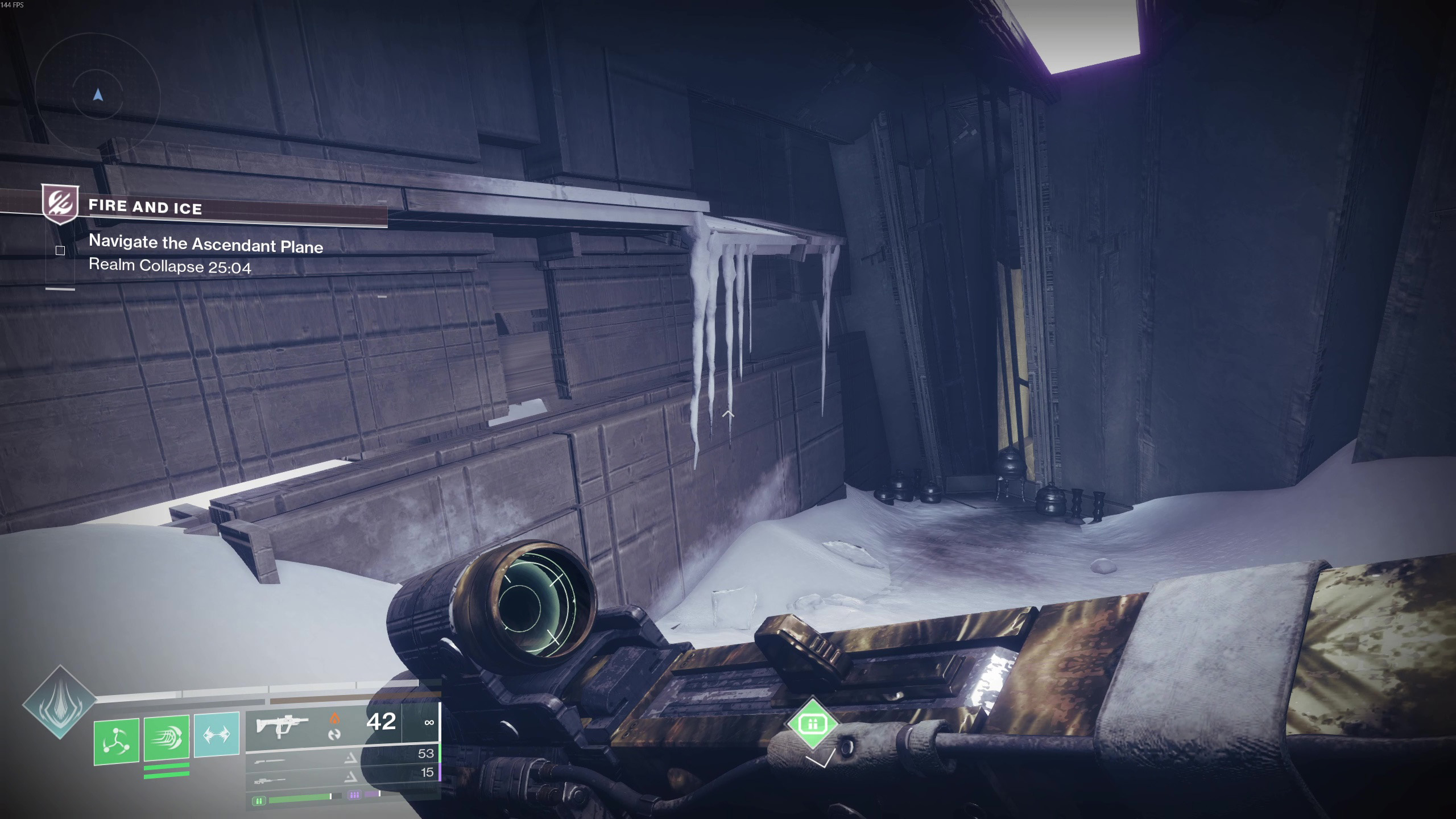 Когда увидите маркер, найдите небольшой выступ, покрытый сосульками. Прыгните на сосульки, затем присядьте и следуйте по выступу, пока он идет вдоль стены и вокруг угла.