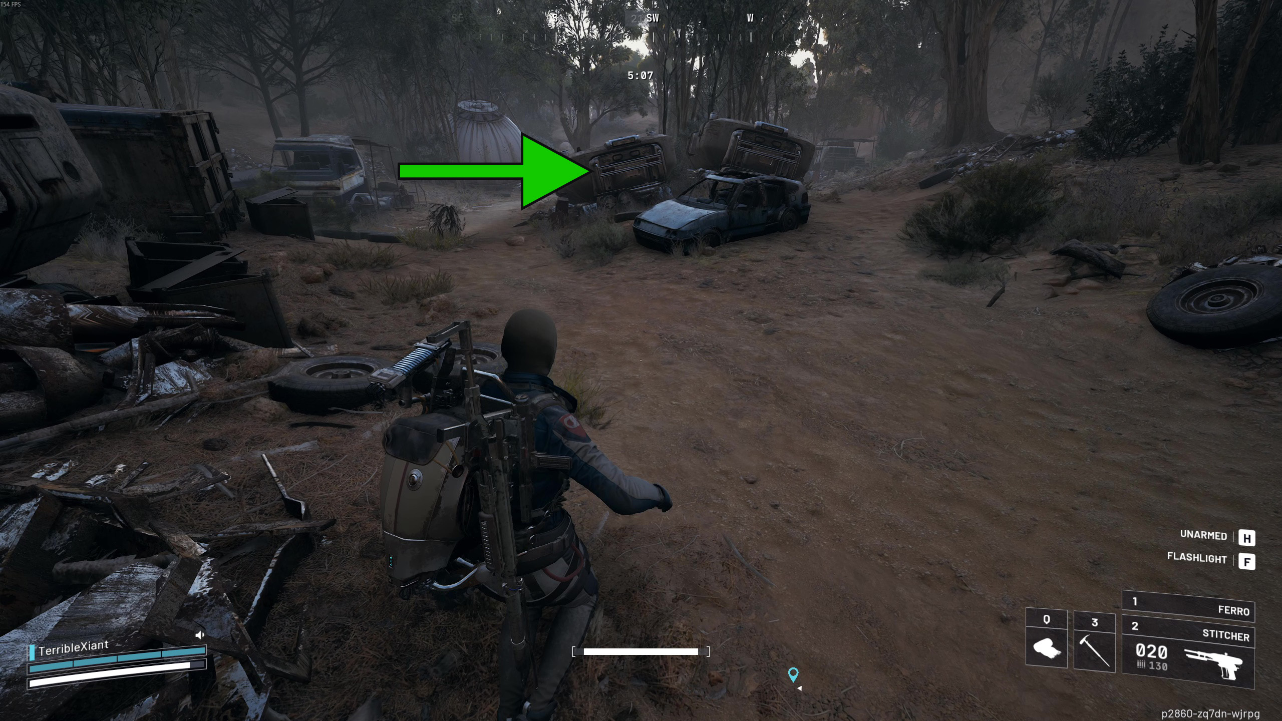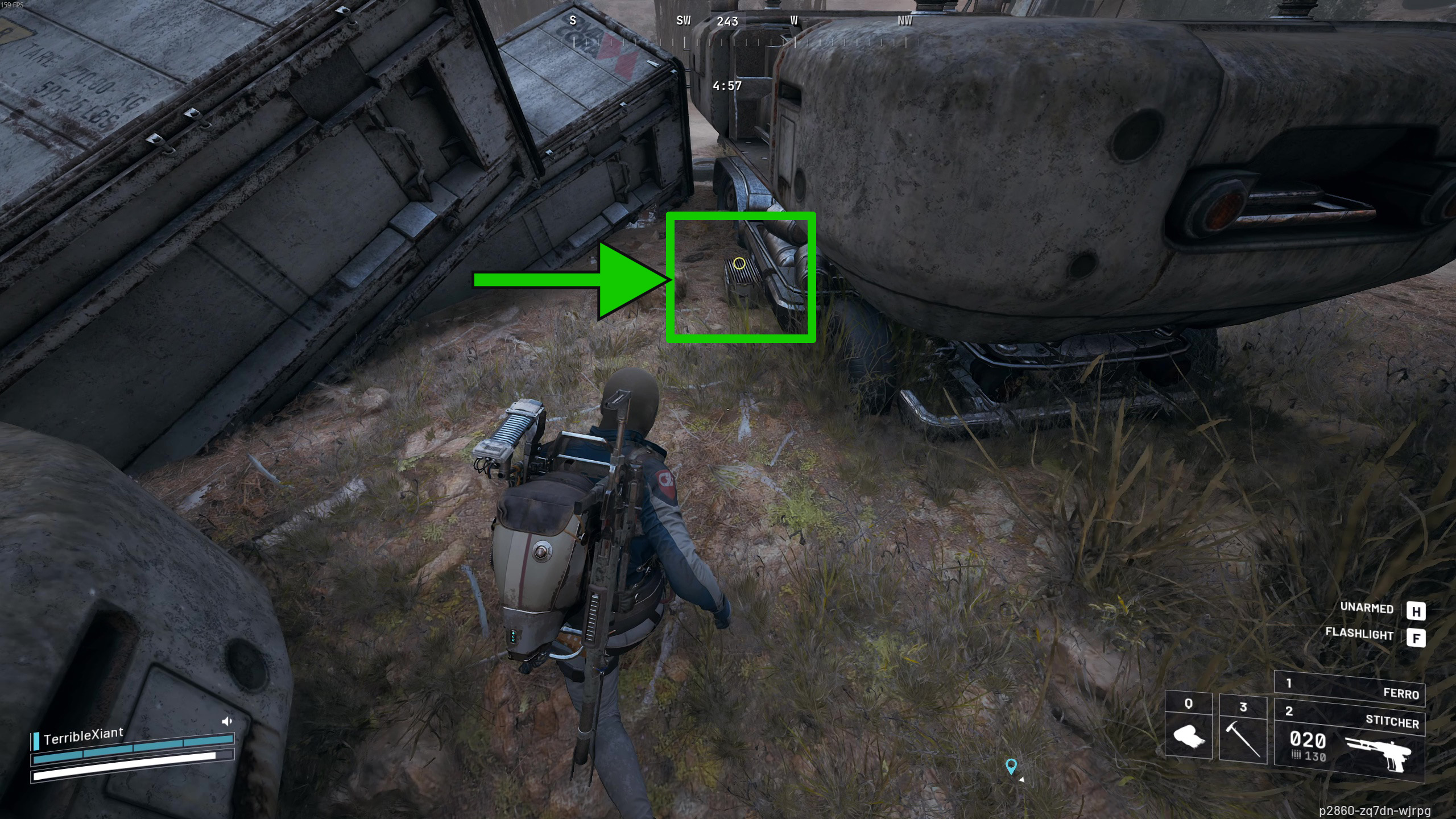 Самый простой способ найти ваше место назначения — использовать машину с сигнализацией в качестве ориентира. Двигайтесь прямо на восток от машины, проходя через промежуток между двумя длинными грузовиками, и вы увидите ящик, который вам нужен — на нём есть лента.