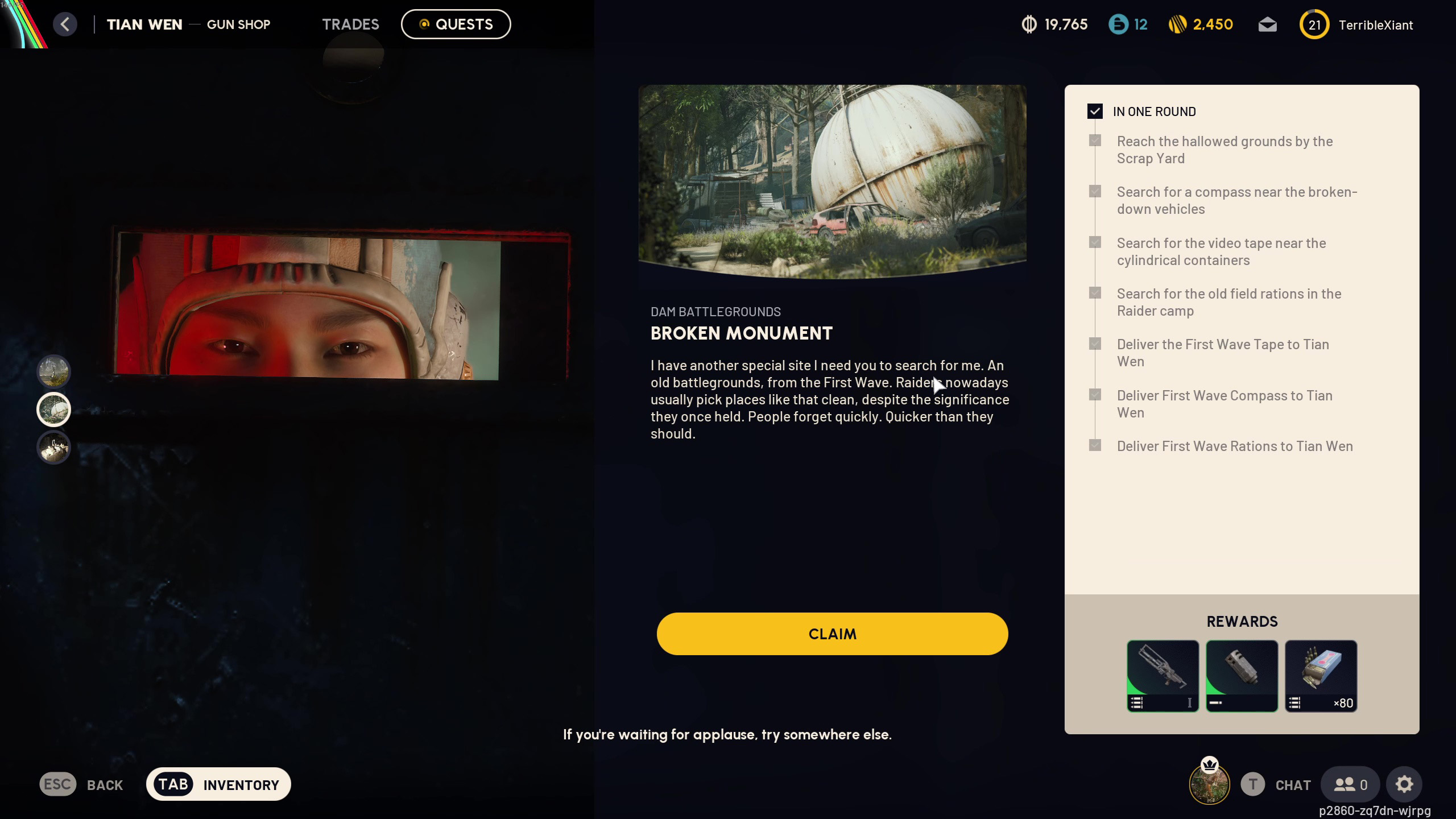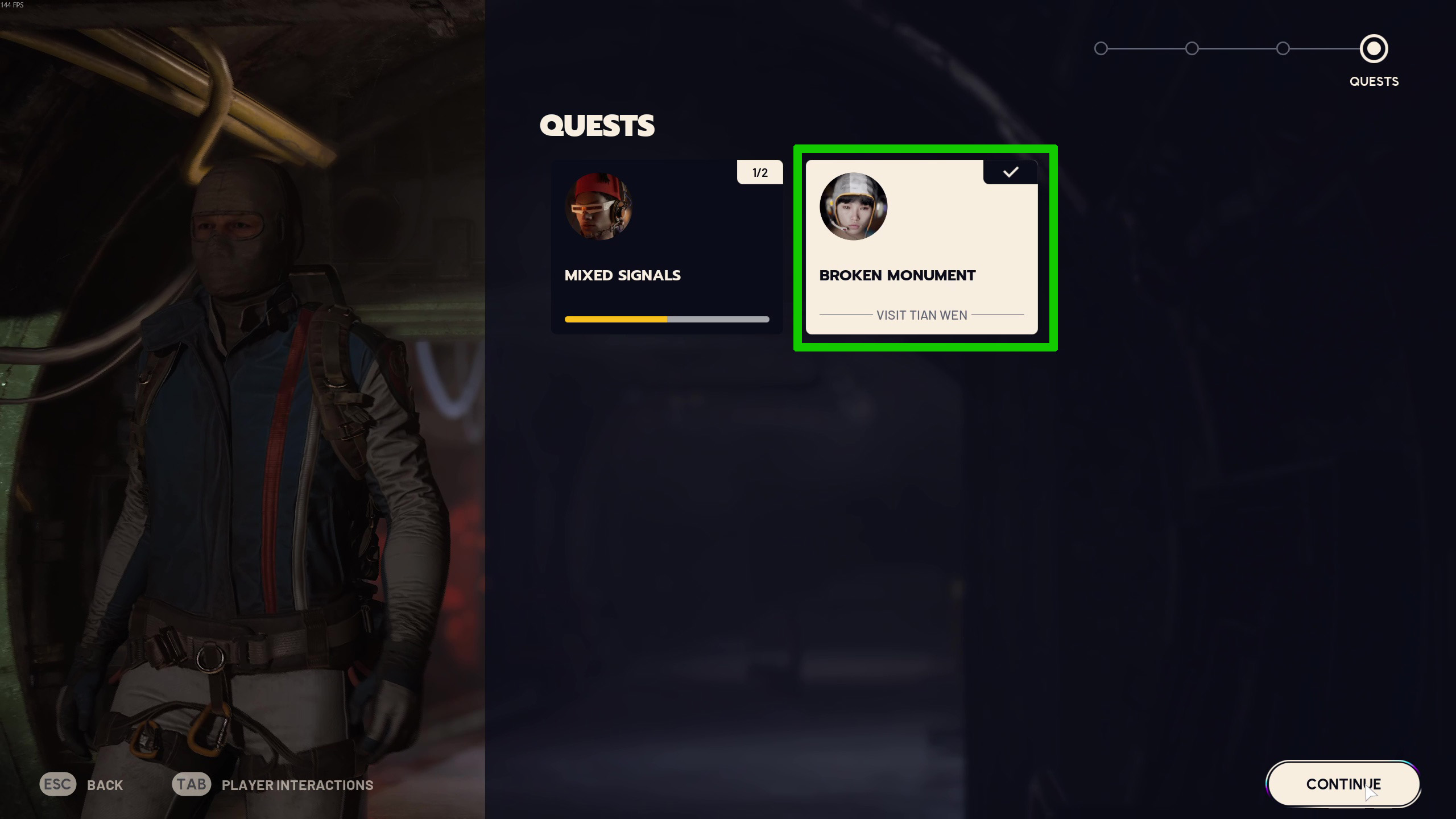 Broken Monument имеет четыре основные цели, но последние просто требуют от вас вернуть три специальных предмета обратно Тянь Вэню. Это происходит автоматически, когда вы возвращаетесь в Speranza со всеми тремя предметами.