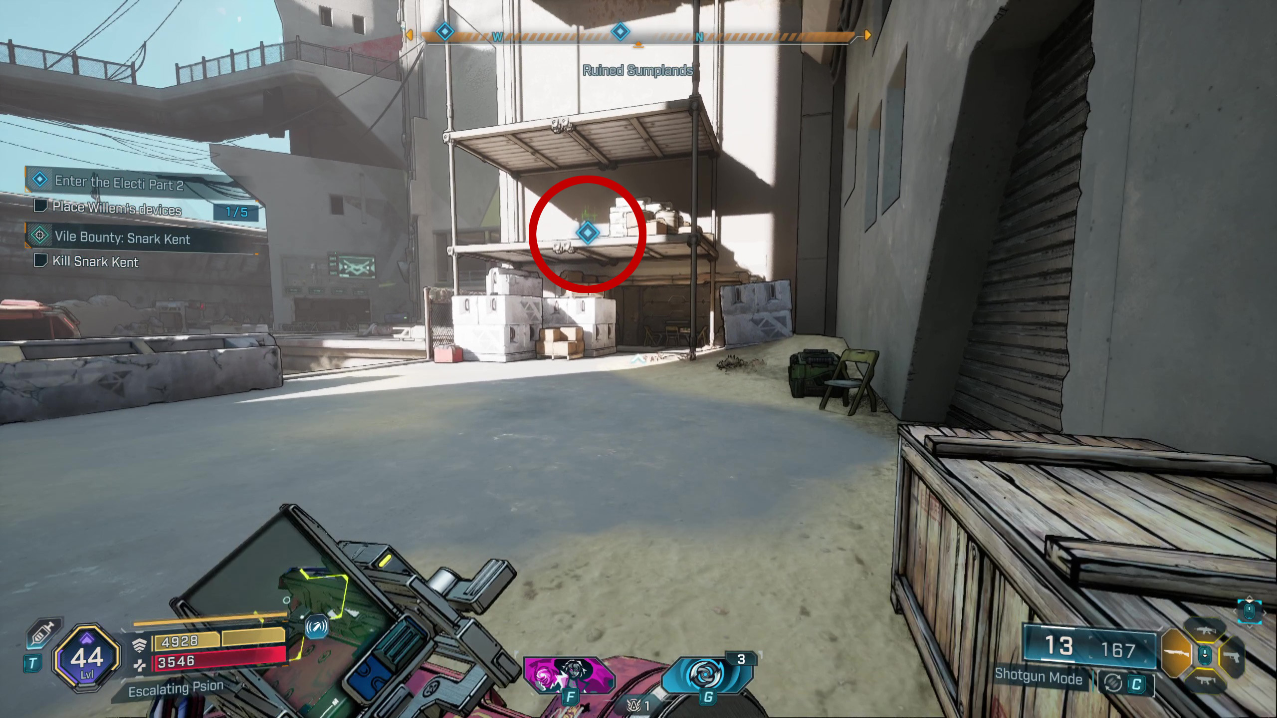 Вам не обязательно сражаться с разрывателями. Вместо этого просто поднимитесь по лестнице возле ящиков с оружием и соберите Эхо-журнал у одного из них. До ящиков можно добраться, прыгнув на ржавое здание рядом с ними, а затем перепрыгнув на лестницу.