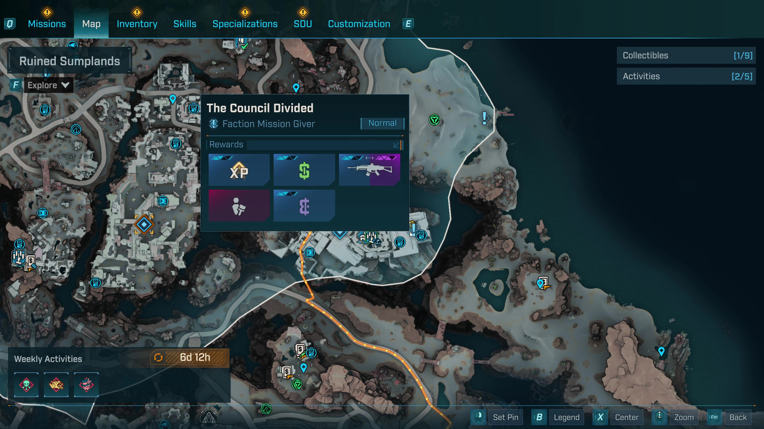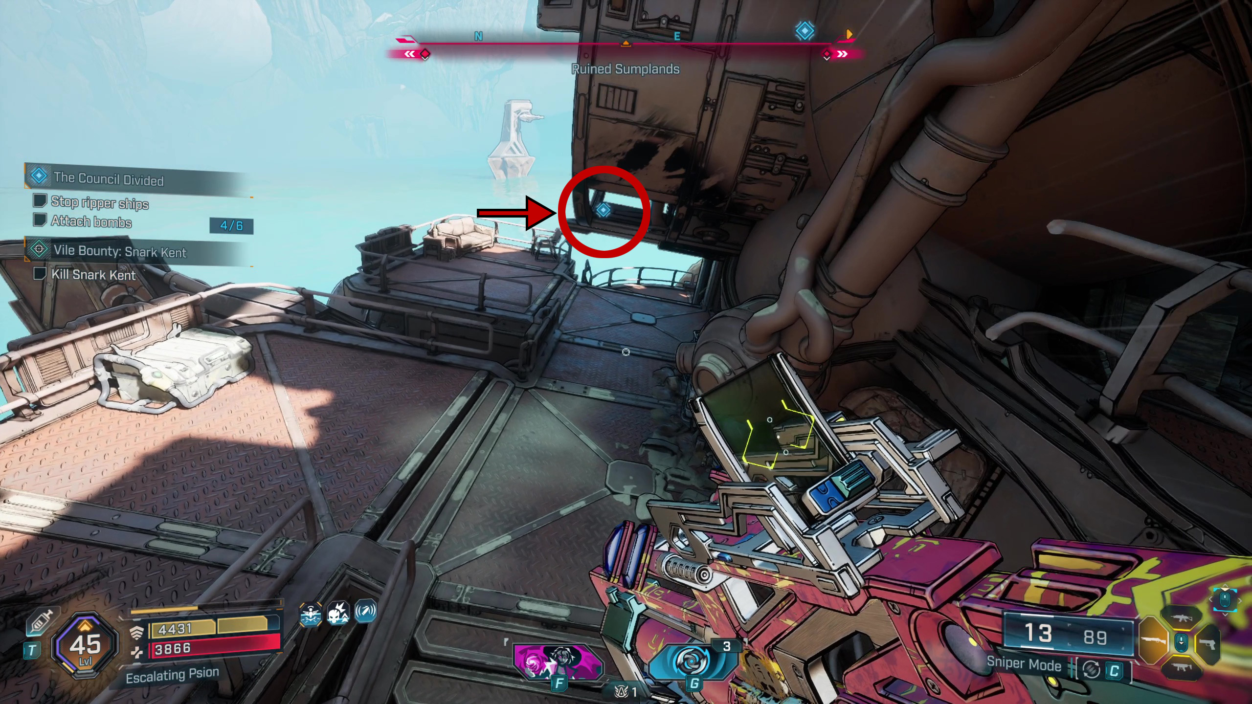 Чтобы начать первое задание фракции Избранных, «Разделённый совет», вернитесь к Левейн и поговорите с Лидером. Большое количество оружия было украдено из Каркадии, и вам нужно будет его вернуть. Быстро переместитесь к хранилищу «Падение Суда», а затем направляйтесь на юго-запад к лагерю Разрушителей.