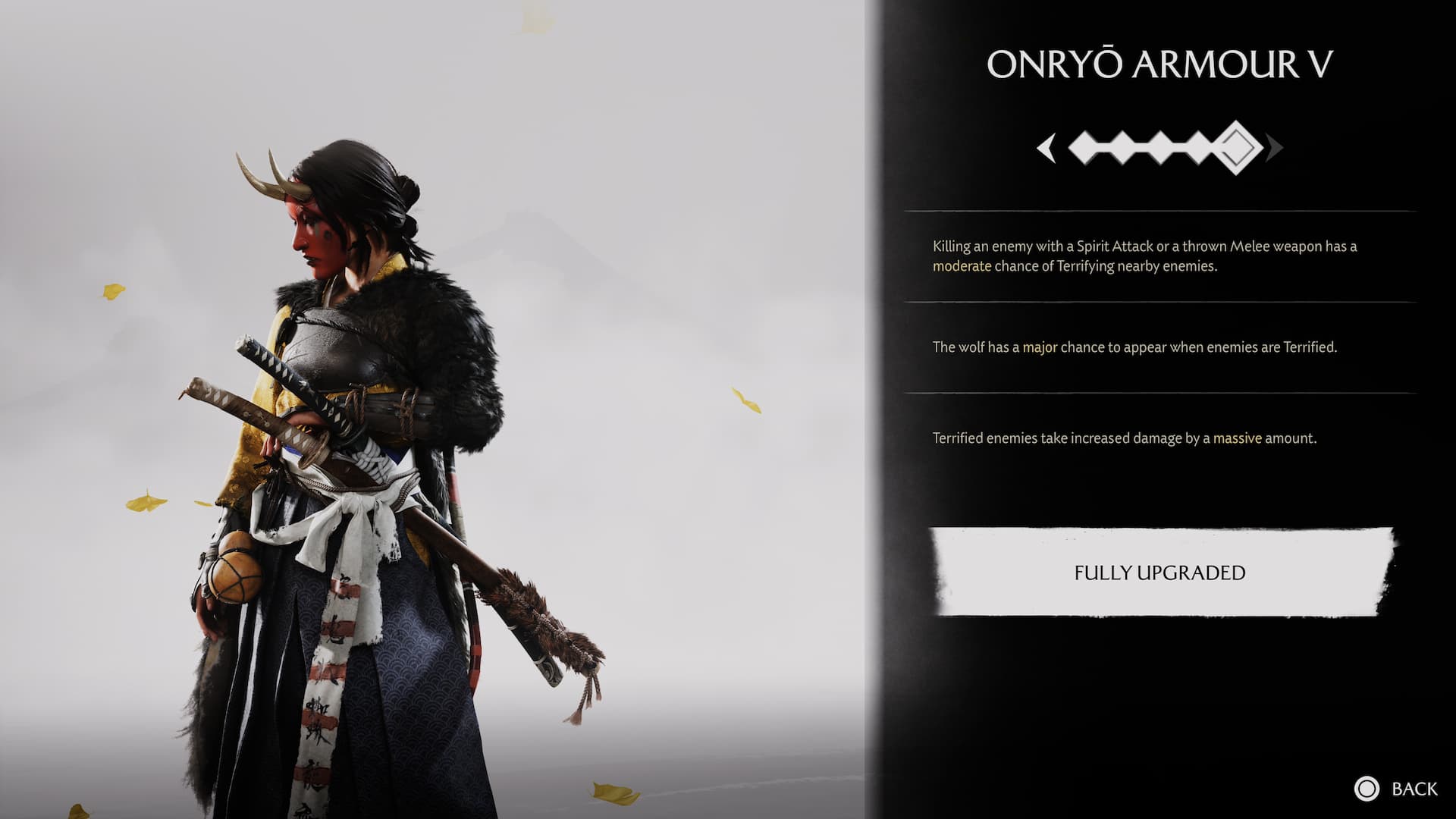 В отличие от большинства доспехов, которые необходимо улучшать, посещая Кузнеца Гинджи и предоставляя определенные материалы, доспехи Онрё улучшаются автоматически по мере прохождения сюжетной линии игры. Это гарантирует, что у вас всегда будут полезные бонусы, связанные с сюжетом, в то время как вы преследуете свою месть.