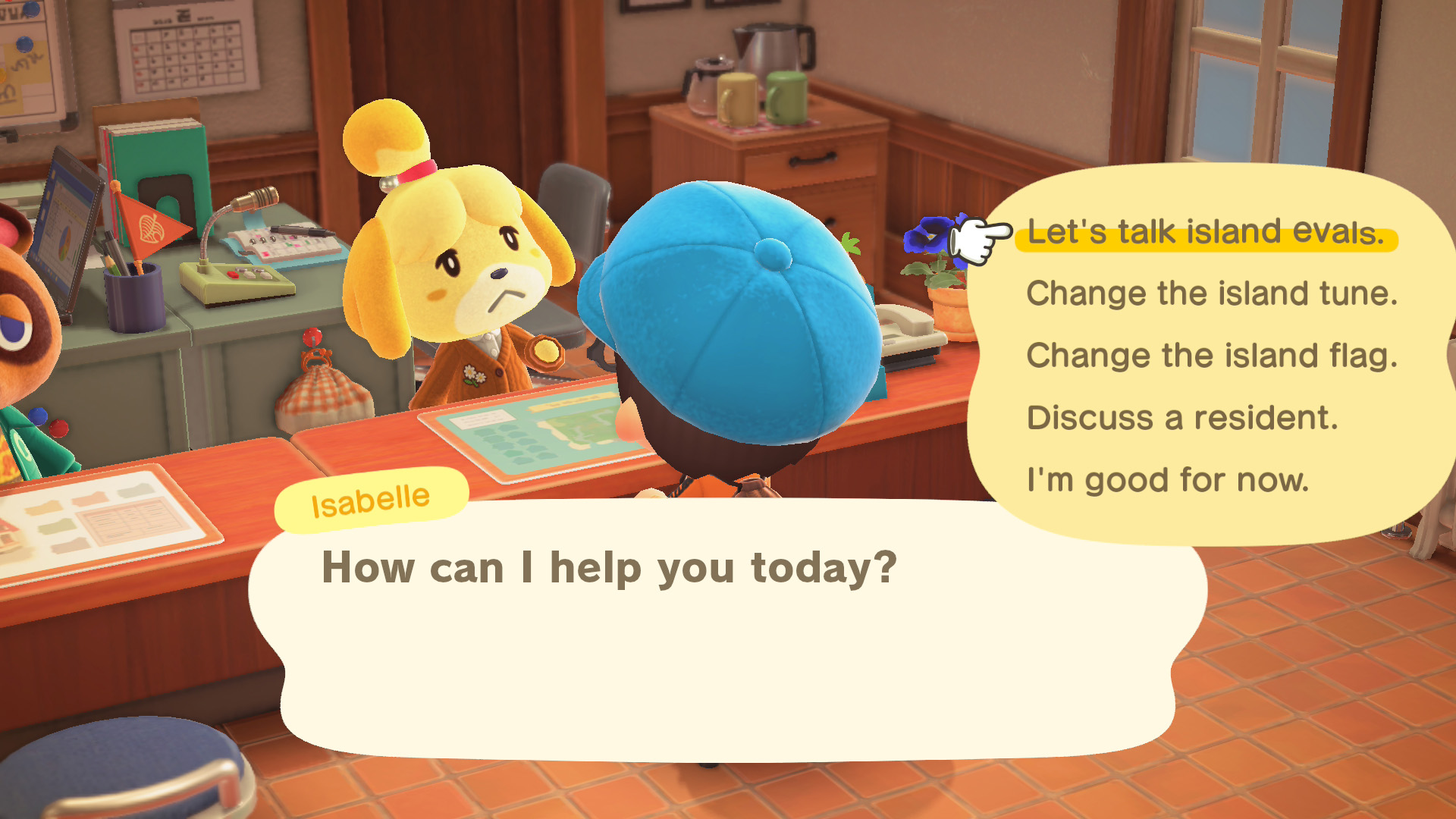 Как только вы начнете строить больше домов, Изабель предложит оценить ваш остров. Когда она это сделает, поговорите с ней и выберите «Давайте поговорим об оценке острова», чтобы узнать, как в данный момент оценивается ваш остров.