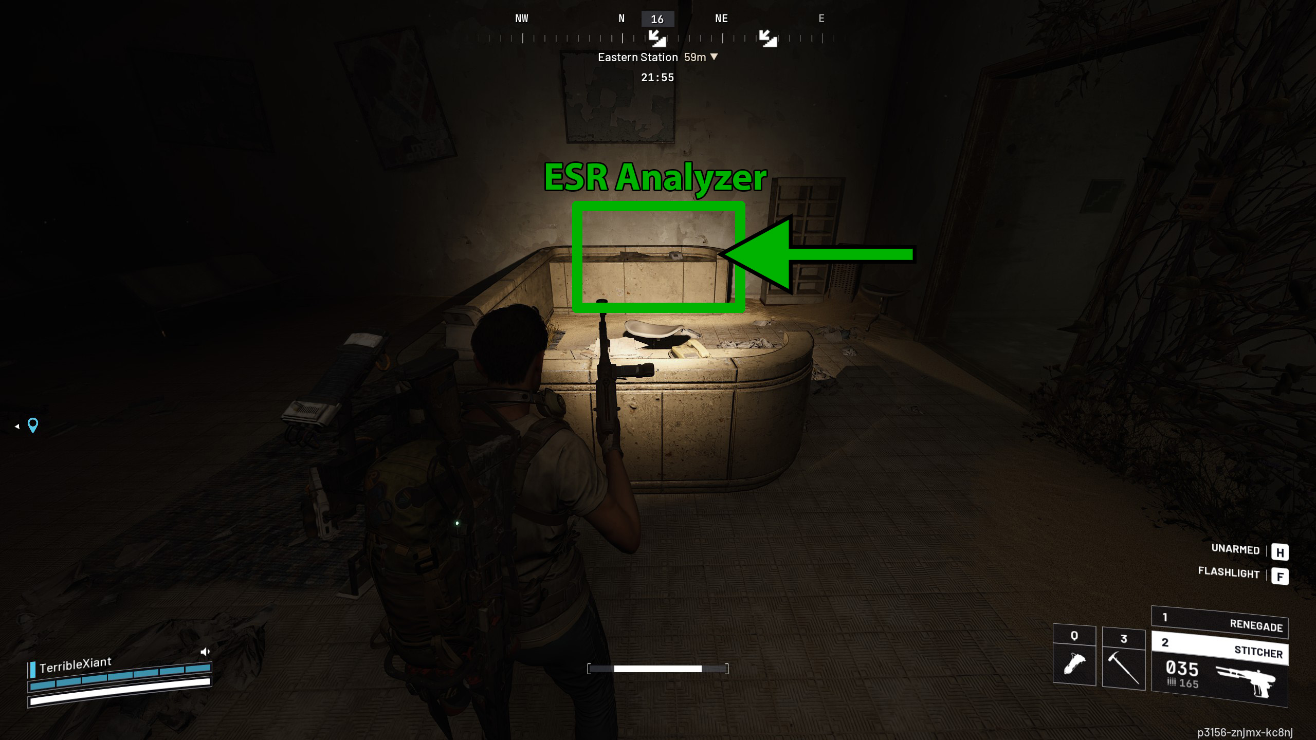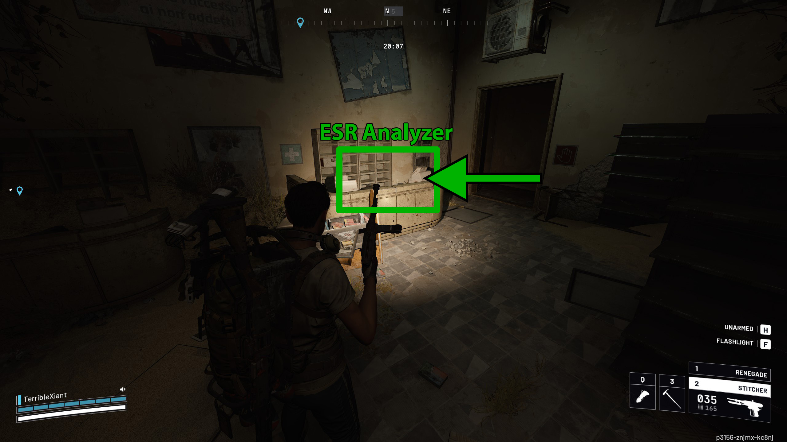 Как только вы войдете в аптеку, пройдите к заднему углу, чтобы найти ESR Analyzer на прилавке. Положите его в свой Safe Pocket, затем достаньте, чтобы завершить задание. После этого вернитесь к Лэнсу в Speranza, чтобы получить свою награду.