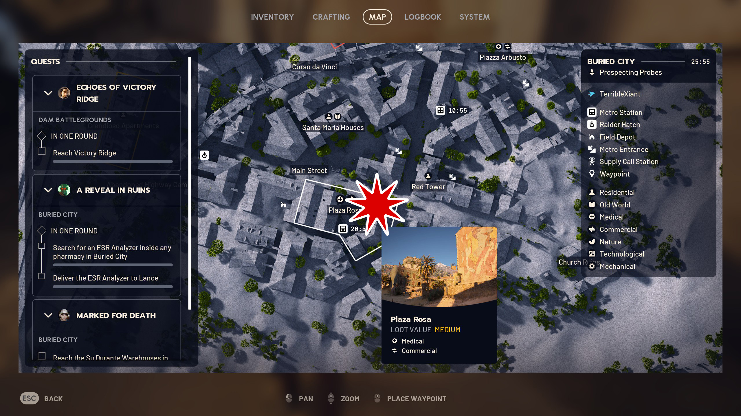 Вы можете найти другую аптеку, до которой легко добраться, на площади Пьяцца Арабусто, на юго-восточной стороне Захороненного города. В отличие от площади Роза, этот район не известен ценными предметами или большим количеством посетителей, что означает, что входить и брать необходимое обычно безопасно.