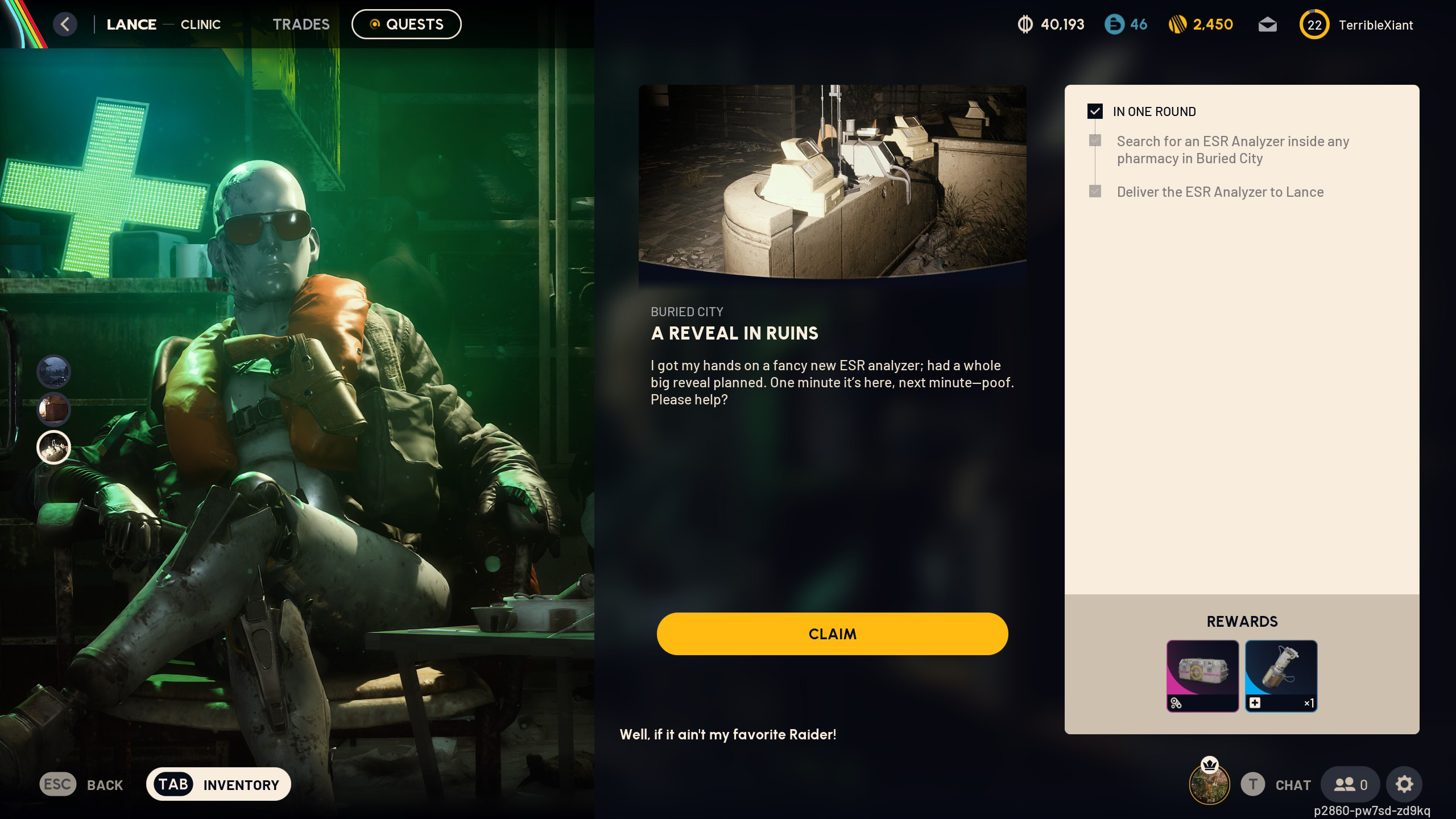 Чтобы завершить квест «Reveal in Ruins», отправляйтесь в любую аптеку в Buried City и найдите ESR Analyzer. Затем верните его Сперанце – помните, ваши Safe Pockets учитываются как часть вашего инвентаря!