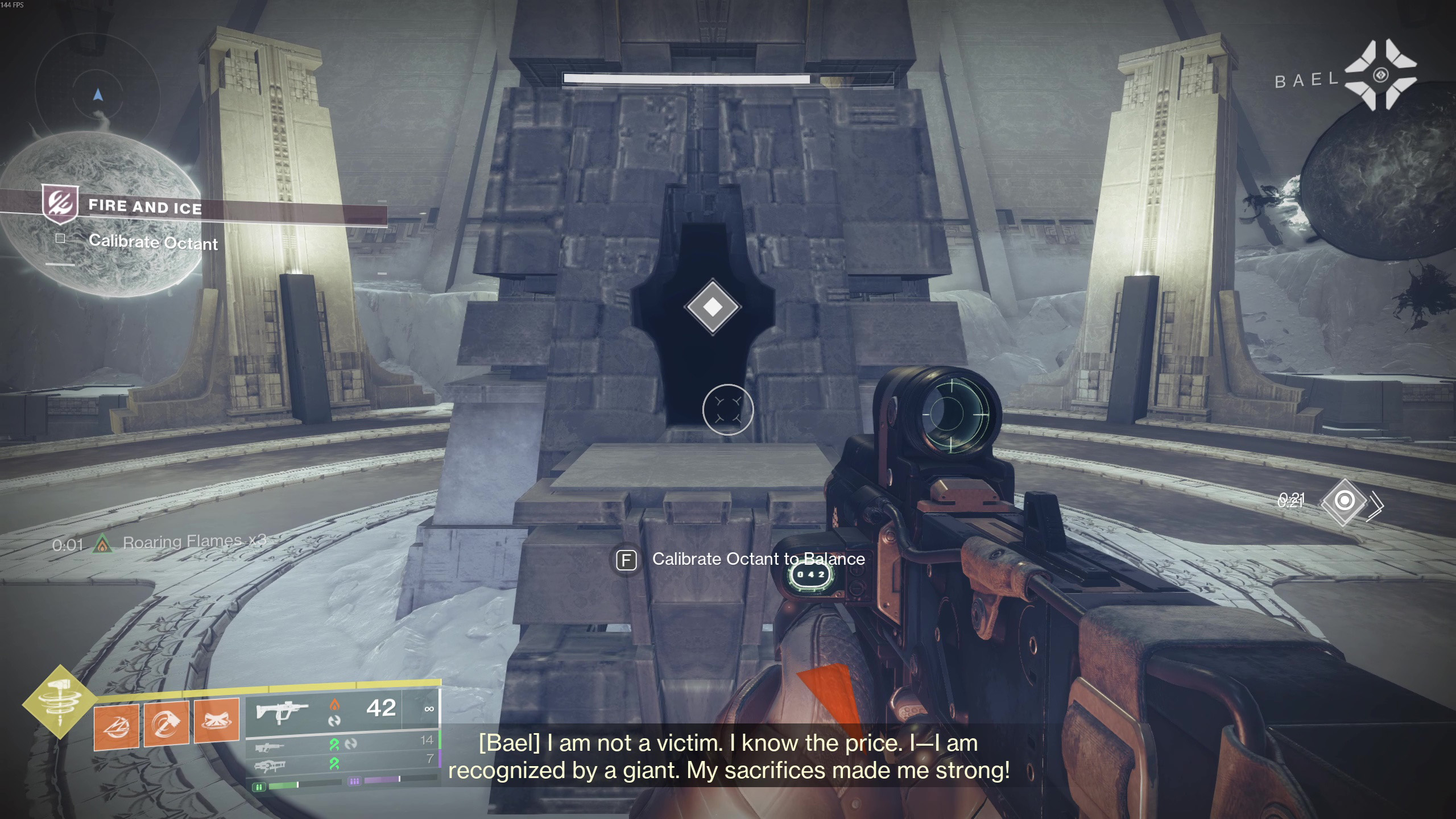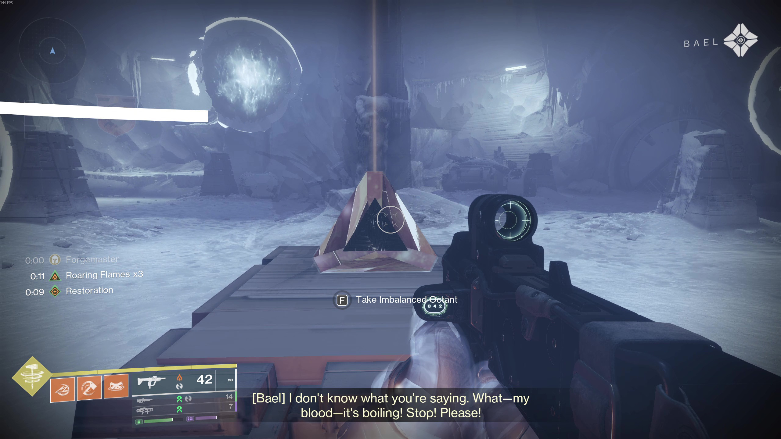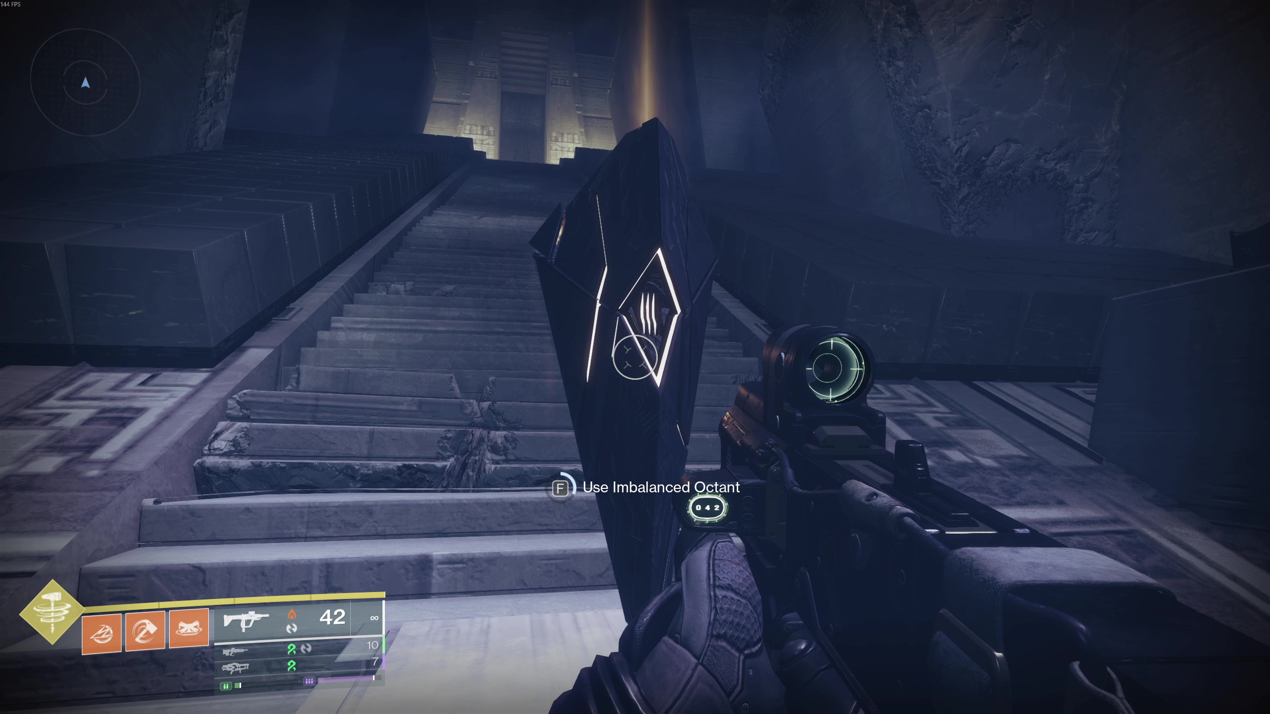 Вернитесь в центр области и активируйте центральное устройство, чтобы откалибровать Октант и сбалансировать его. После того, как он будет сбалансирован, подберите Сбалансированный Октант и вернитесь ко входу в арену, чтобы использовать портал. Затем используйте как Октант, так и тотем Тьмы, чтобы продолжить.
