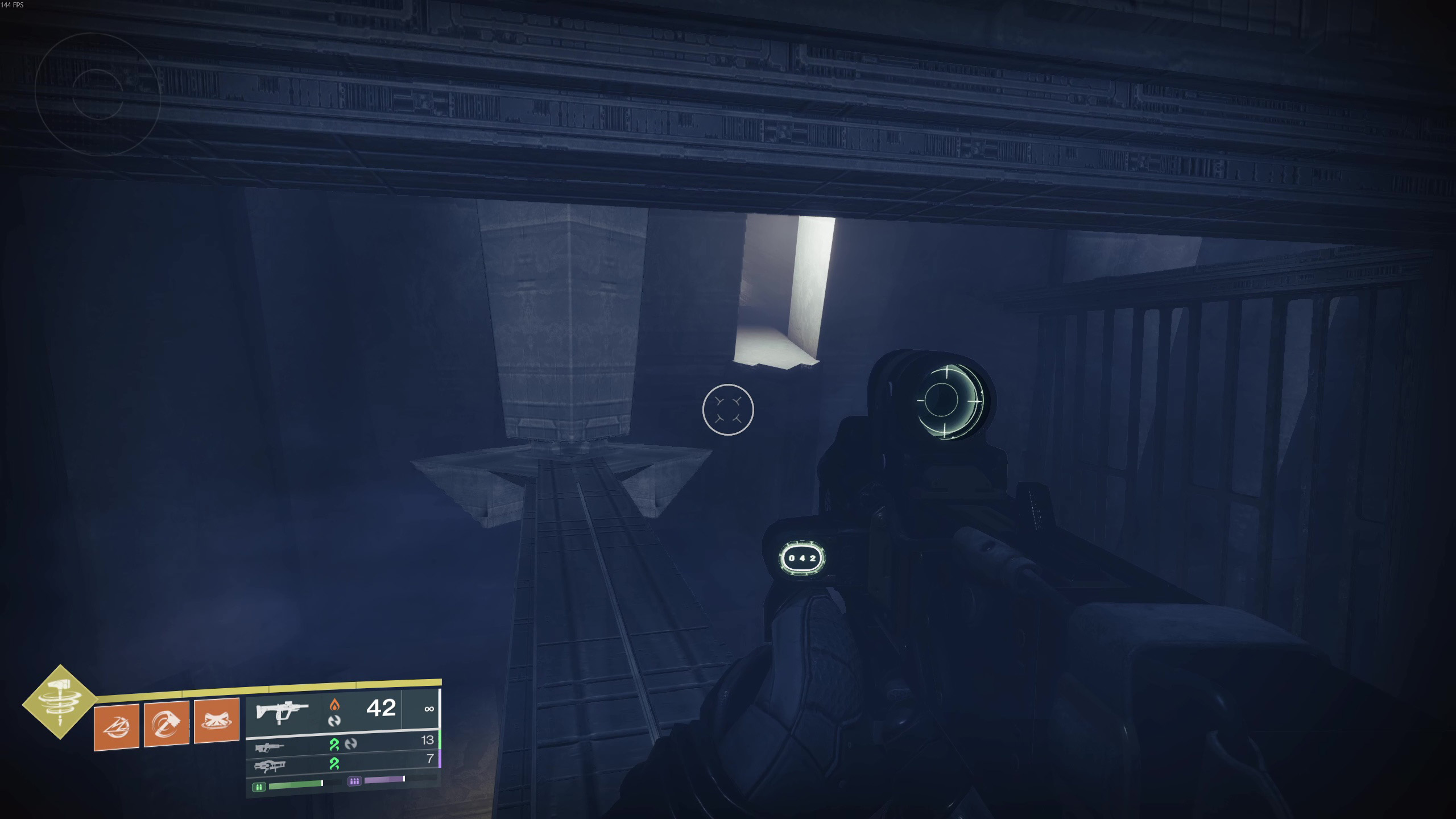 Поднимитесь по лестнице, и после того, как пройдете короткий коридор с желтыми огнями, поверните налево и перепрыгните через разрыв. Продолжайте прыгать влево оттуда, перемещаясь по каждой платформе.