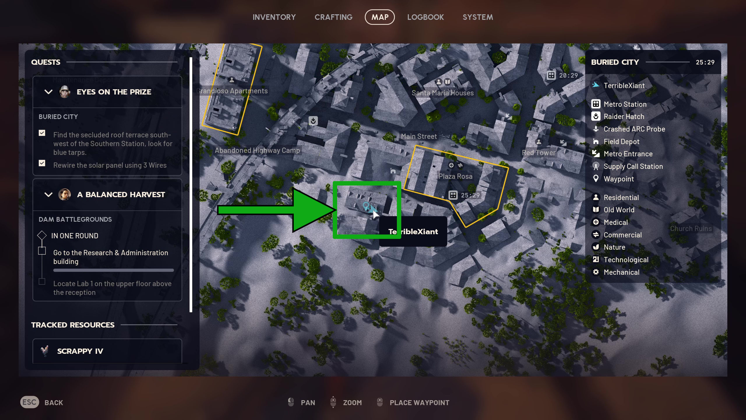Скрытая крышная терраса, которую вы ищете, находится в юго-западной части Заброшенного Города. Вы найдёте её на крыше здания, расположенного непосредственно к юго-западу от зоны лута Piazza Roma. Ищите здание со множеством прямоугольных окон – это единственное в своём роде в этой области.