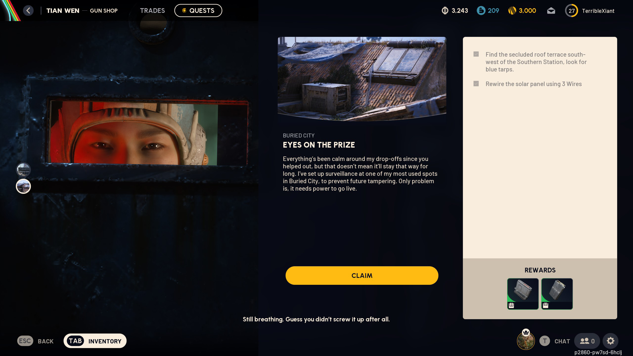 Чтобы завершить квест «Eyes on the Prize», просто отправляйтесь в самую юго-западную часть Buried City и почините сломанный ящик питания тремя Wires. Всё, что нужно! Вам не нужно выполнять какие-либо специальные требования или преодолевать дополнительные испытания – просто найдите или соберите три Wires и почините ящик, чтобы завершить квест.