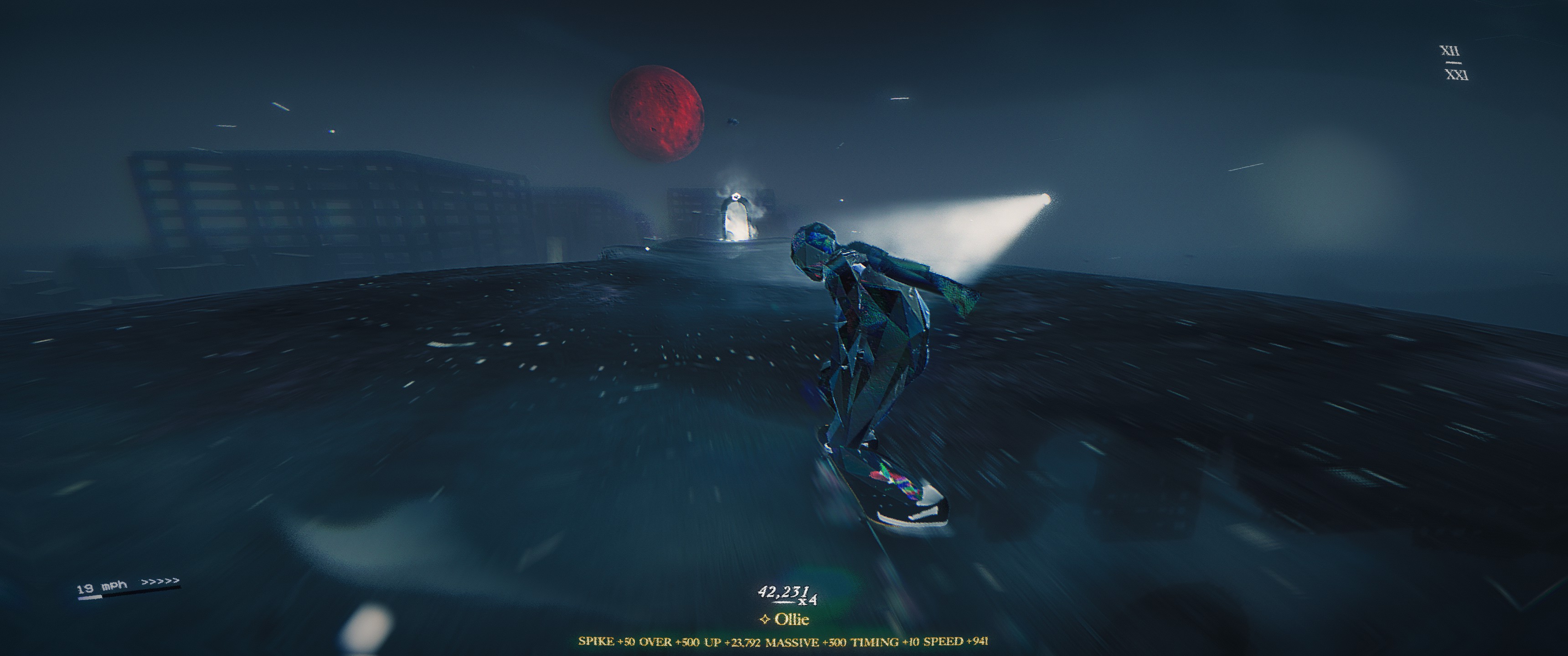 Окей, так что Skate Story меня просто поразила. Очевидно, что её создавали люди, которые любят скейтбординг – она действительно передаёт всю атмосферу и культуру. Играть в неё – всё равно что оказаться внутри безумного, потрясающего скейт-видео 90-х, а работа с камерой делает всё эпичным. Плюс, музыка Blood Cultures идеальна – расслабляющая и атмосферная, когда ты просто катаешься, а затем супер-интенсивная во время битв с боссами. Художественный стиль тоже очень уникален – персонажи выглядят потрясающе, освещение фантастическое, а окружение просто красивое и дикое. Серьёзно, визуальные эффекты – огромная часть того, что делает эту игру такой особенной.