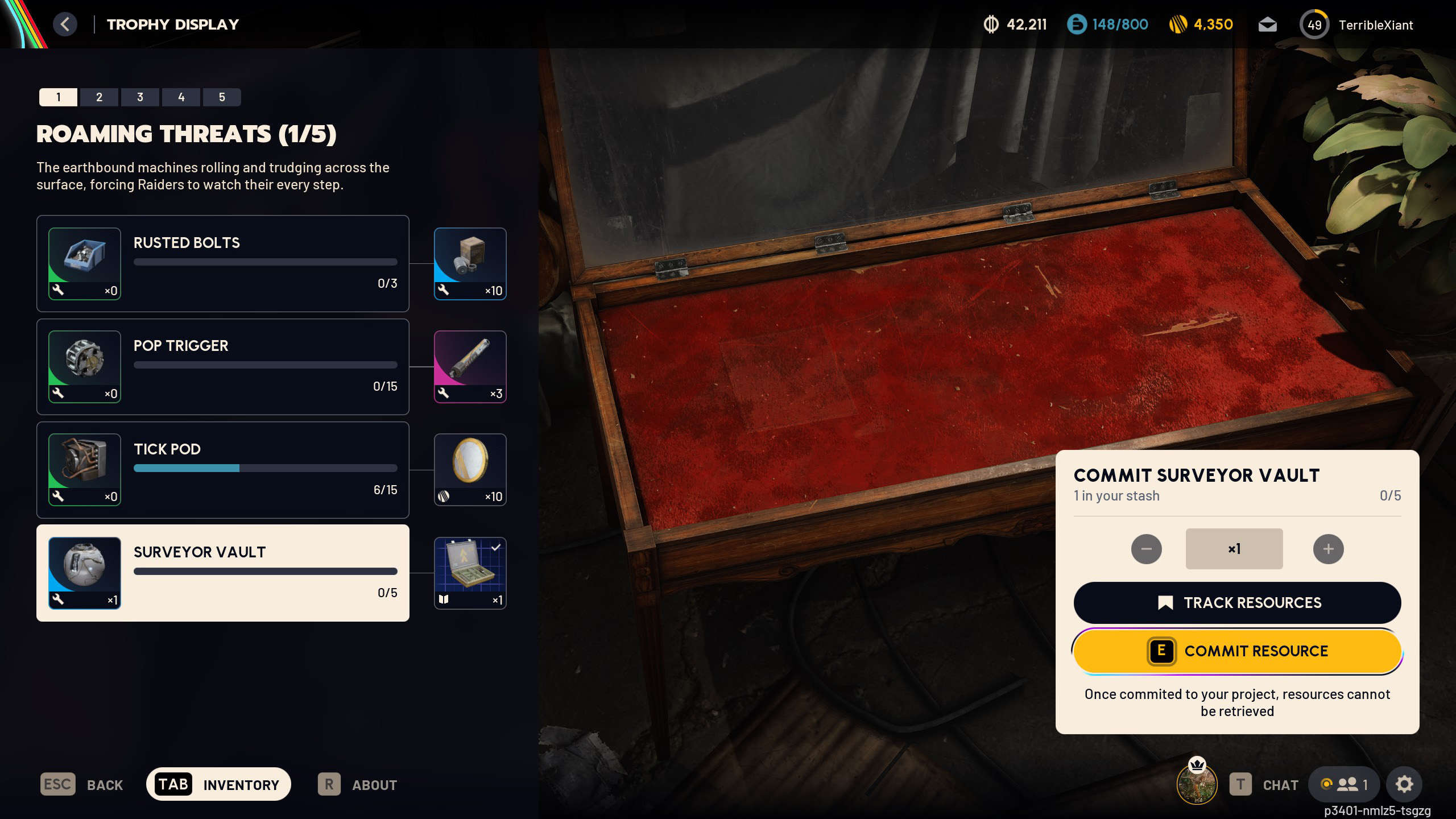 Проект «Трофейная Витрина» имеет пять уровней улучшения, и для каждого из них требуются всё более редкие предметы. Будьте готовы разбирать много всего – от обычных врагов, таких как Bastions и Rocketeers, до самых мощных существ в ARC, включая Queens и Matriarchs.