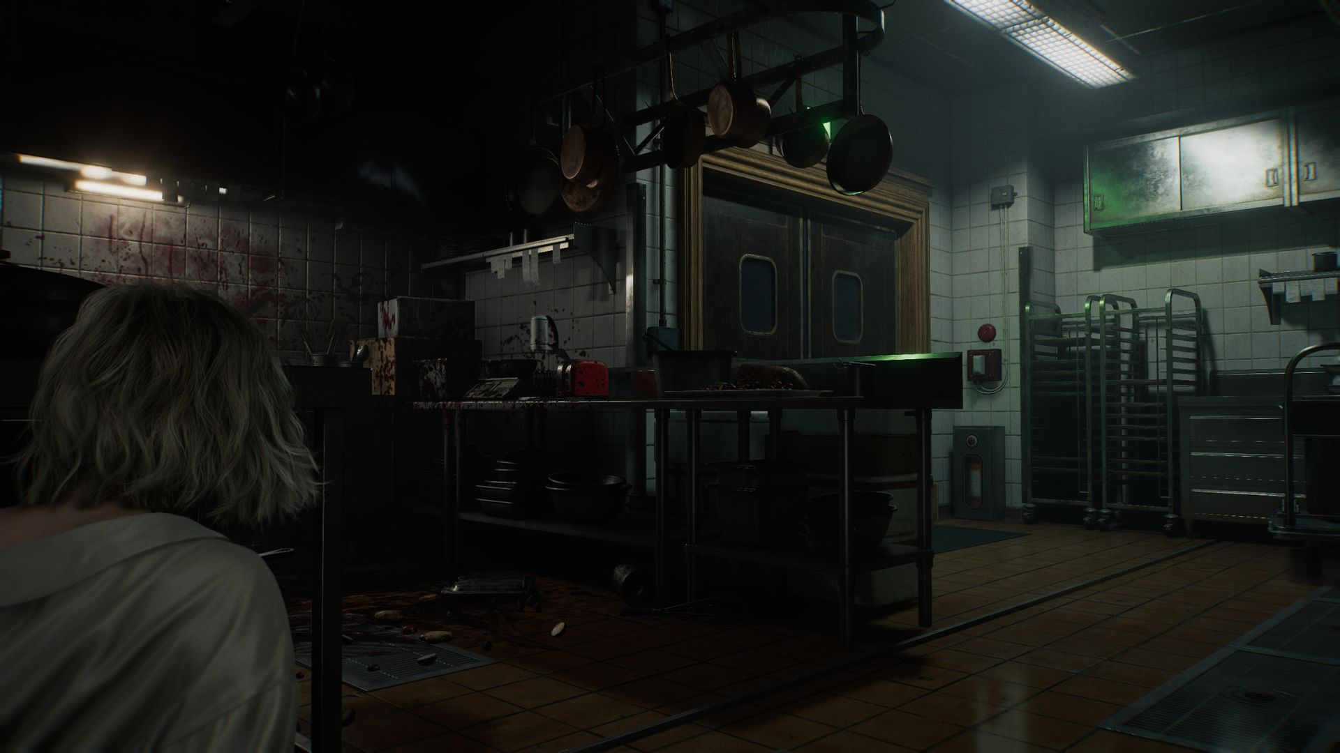 Игра сначала показывает вам шеф-повара – большого зомби, постоянно рубящего мясо и вытаскивающего куски из контейнера, наполненного кровью. Это сразу же устанавливает намеренный, более медленный темп игрового процесса Grace, а также даёт понять, что этот зомби – опасный враг, который может быстро победить вас своим ножом.