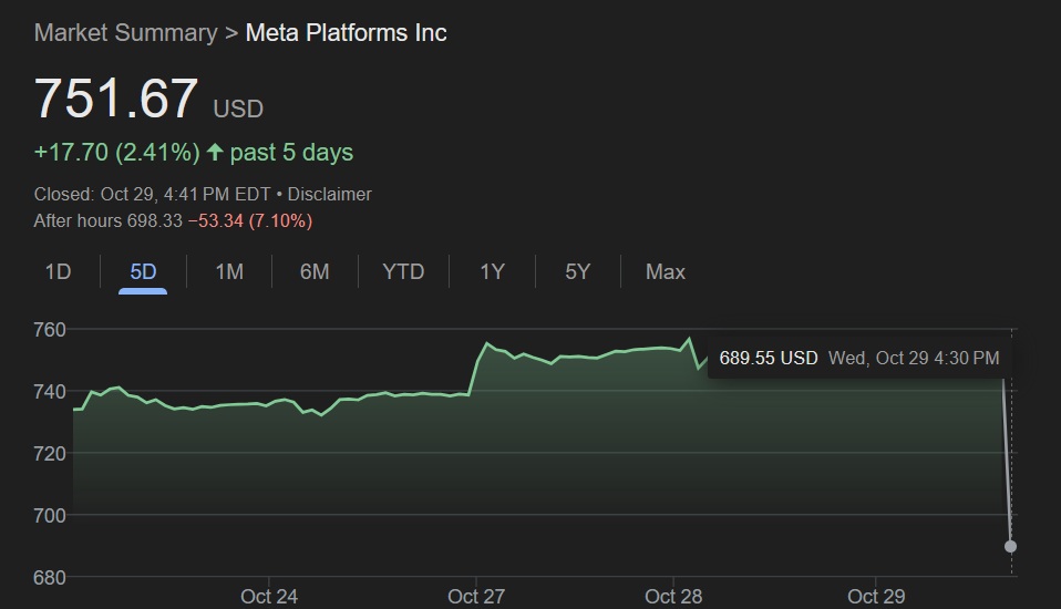 В конечном итоге, Meta сообщила о прибыли на акцию (EPS) в размере 1,05 доллара США, что значительно ниже 6,61 доллара на акцию, предсказанных аналитиками Уолл-стрит, и 7,21 доллара на акцию, оцененных Earnings Whisper. Meta заявляет, что исключая определенный кредит, их EPS составили бы 7,21 доллара на акцию.