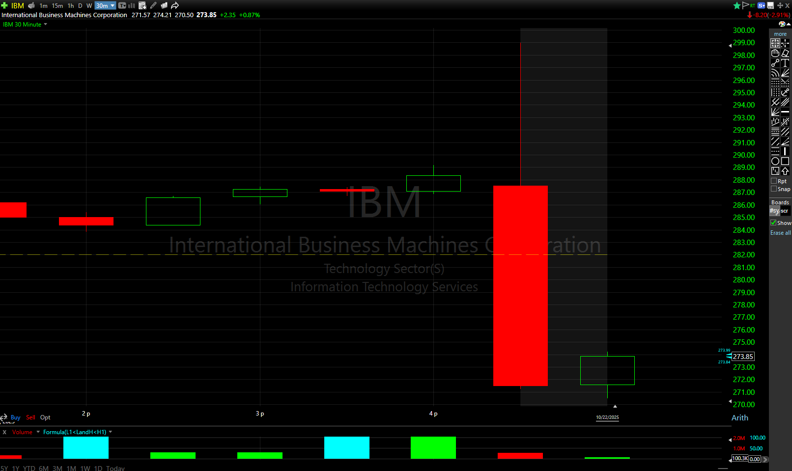 Несмотря на то, что IBM сообщила о более высокой выручке и прибыли на акцию, чем ожидалось, цена ее акций резко упала после закрытия рынка. Это падение, вероятно, было вызвано результатами, которые оказались ниже ожидаемых по сравнению с предыдущим кварталом. Цена акций опустилась до $271.53, по сравнению с ценой закрытия в $287.83.