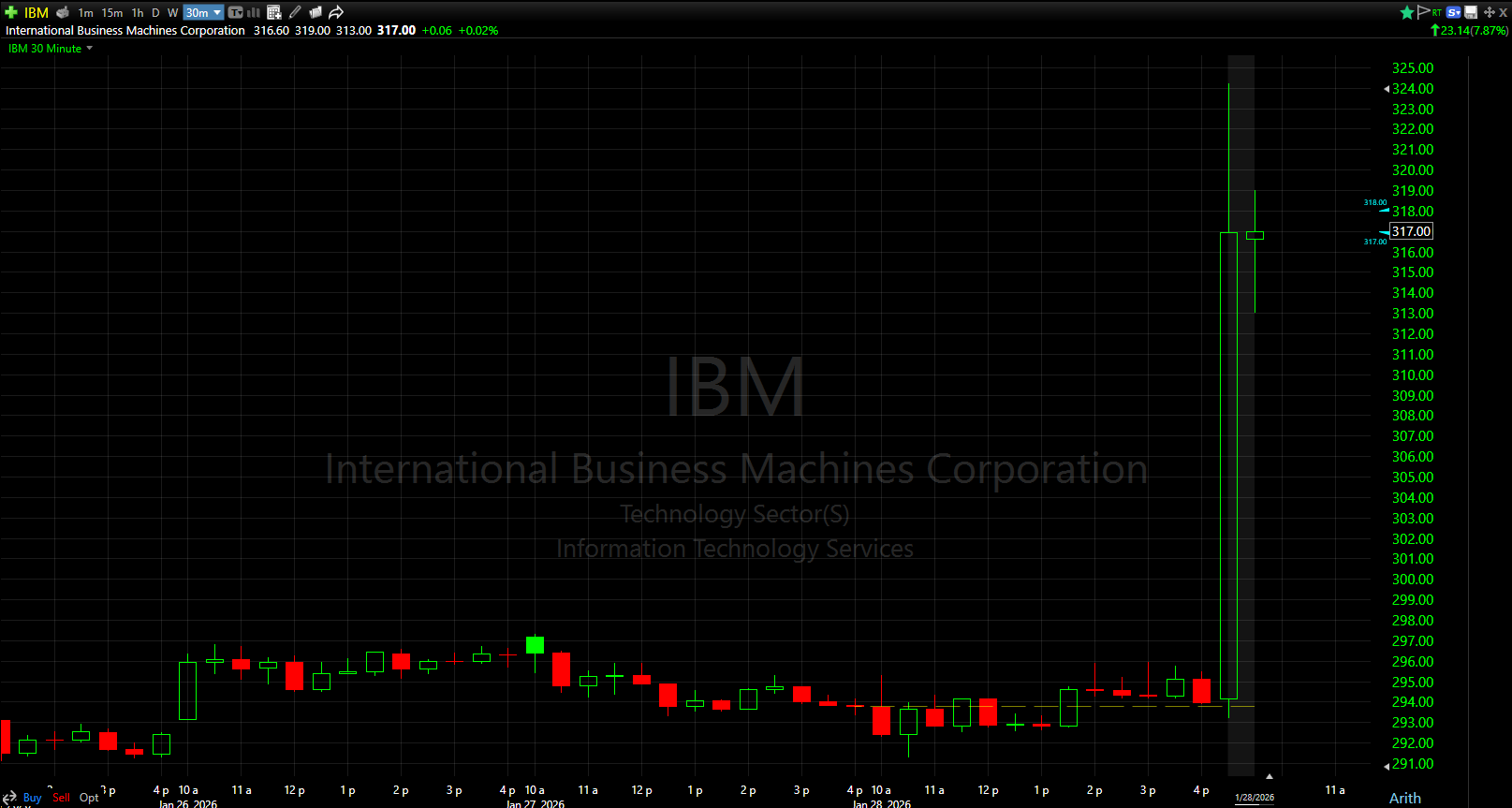 Вау, акции IBM действительно подскочили после закрытия торгов! Они завершили день на отметке $294.11, но затем взлетели до $322.64 – это довольно значительное изменение!