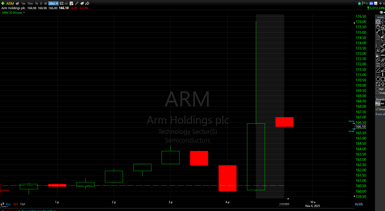 После публикации Arm Holdings (ARM) своего последнего отчета о доходах, цена акций компании подскочила в ходе внебиржевых торгов. Акции выросли до $167.02, по сравнению с закрывающей ценой в $160.19 ранее в тот день.