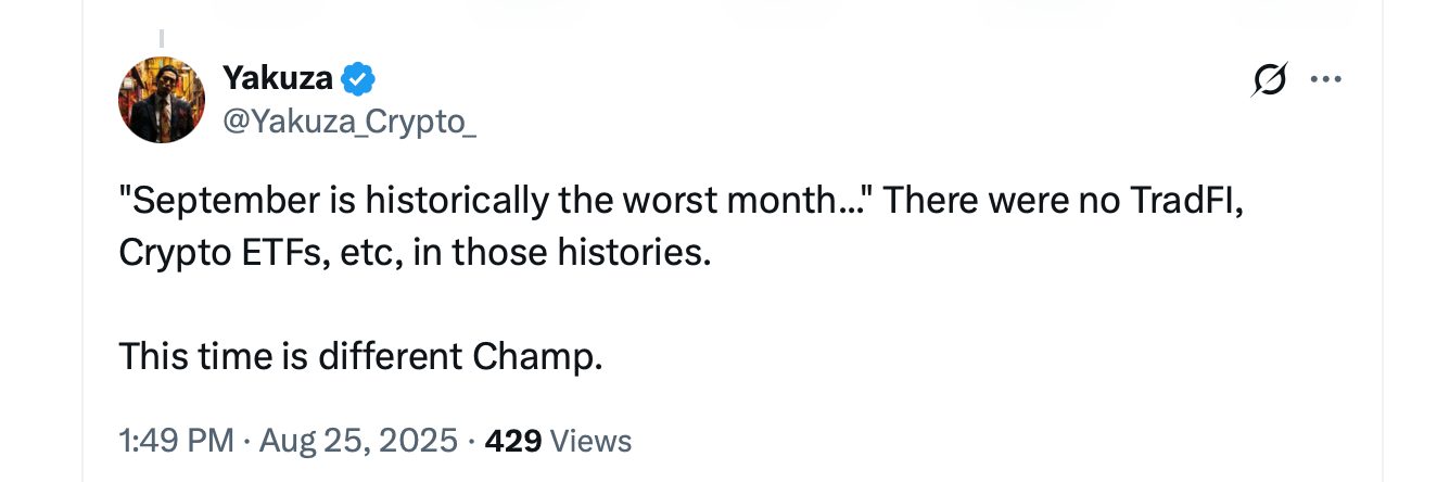 Как заметил один пользователь социальной сети X в понедельник: «Сентябрь исторически является самым плохим месяцем для доходности первой криптовалюты. Идеальное время, чтобы накопить подешевле». Trendspider также добавил: «Сентябрь — сложный месяц не только для акций, но и для первой криптовалюты, это был один из самых слабых месяцев с 2015 года».