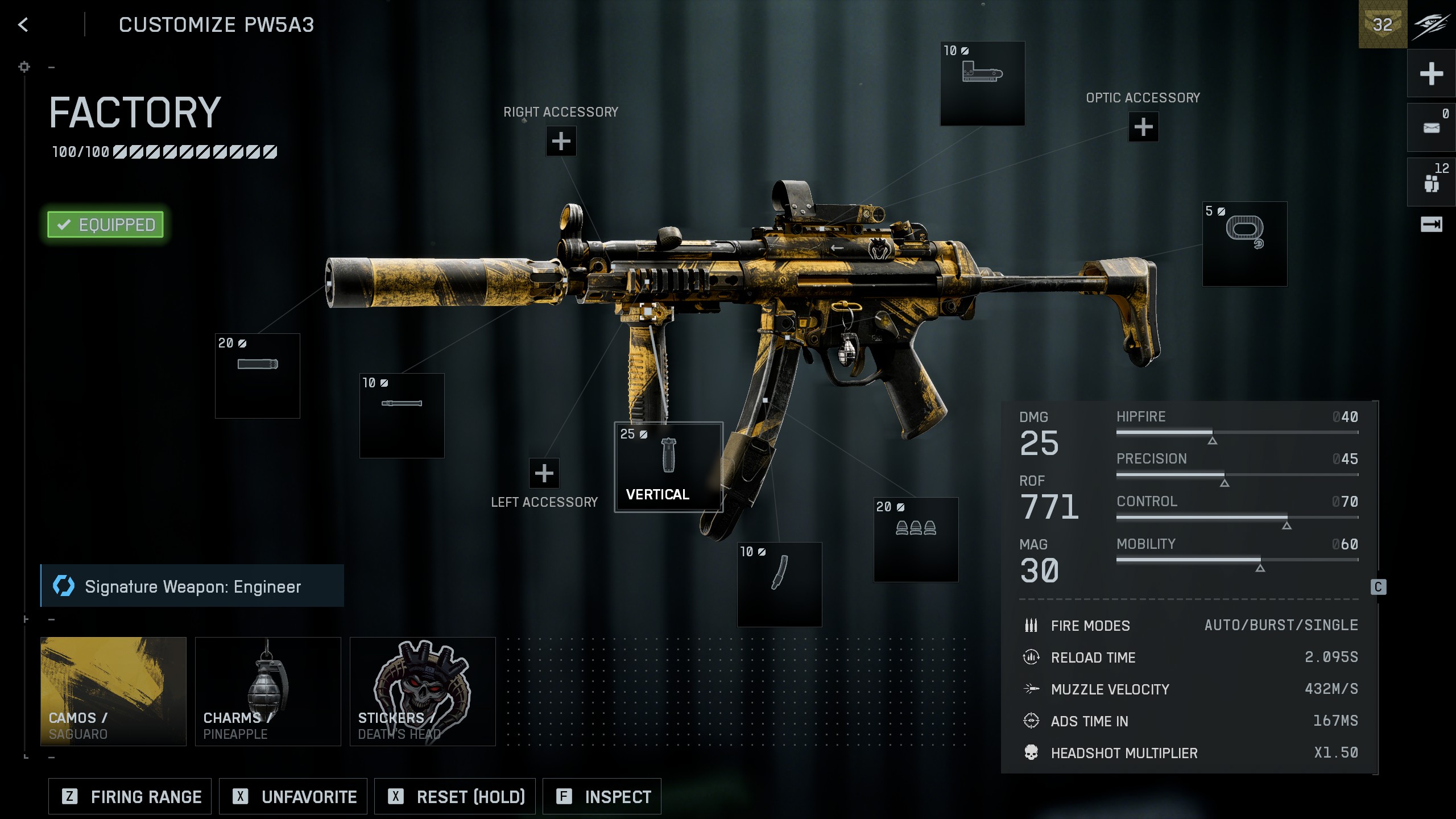 | Hipfire | Скорость раскрытия прицела при стрельбе очередями с рук. Более высокий параметр удерживает прицел собранным дольше. | Лазер и фонарик для правого/левого аксессуара, несколько бочек. |