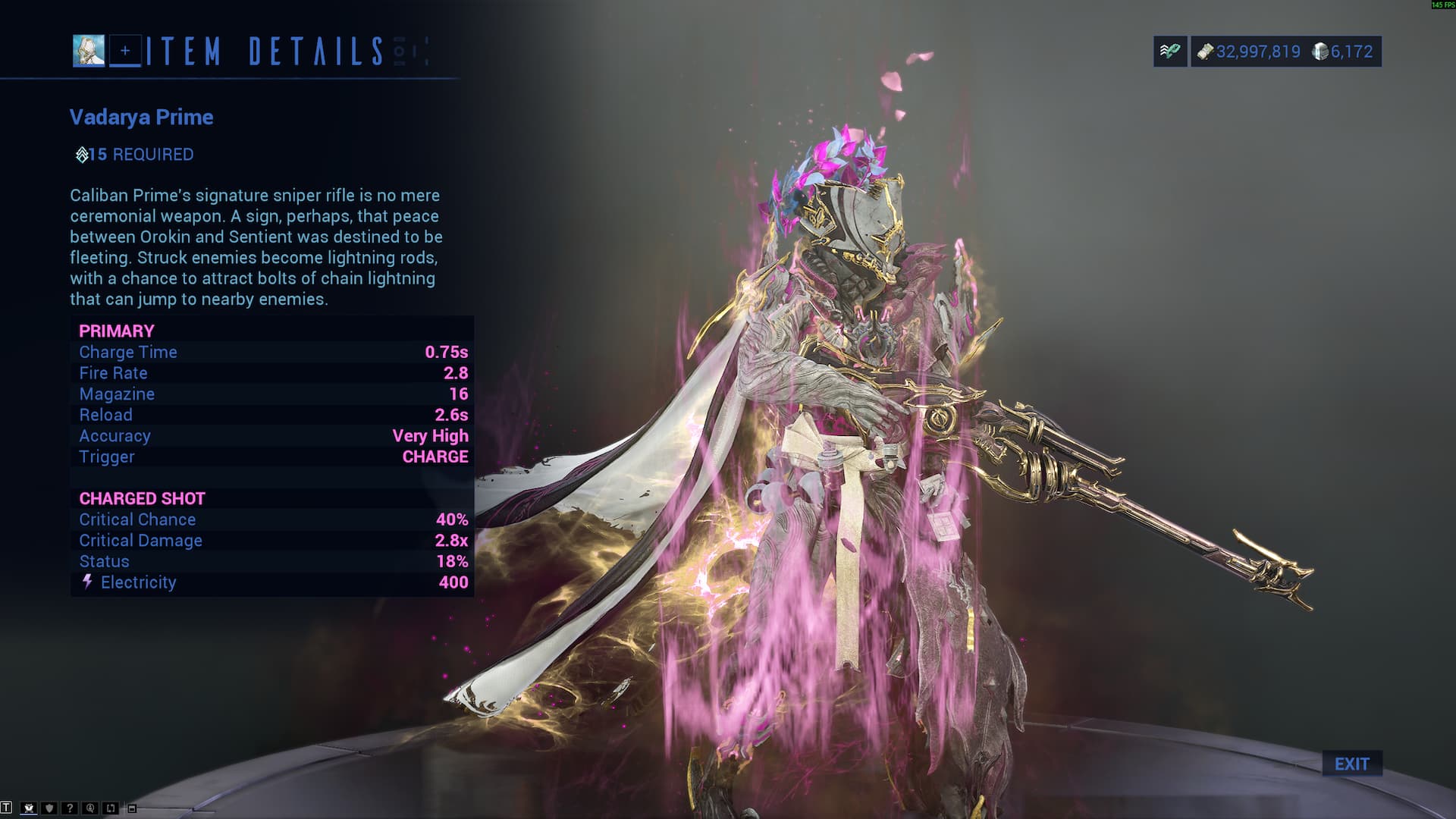 В игре Warframe Вадария Прайм – это снайперская винтовка, принадлежащая Калибану. Однако она предназначена не только для нанесения урона одной цели, но и выполняет множество функций. Когда враг получает попадание из этого оружия, изначально использовавшегося в церемониях, он превращается в проводник электричества. Это превращение заставляет врагов действовать как молниеприемники, выпуская цепные разряды молний в других находящихся поблизости врагов.
