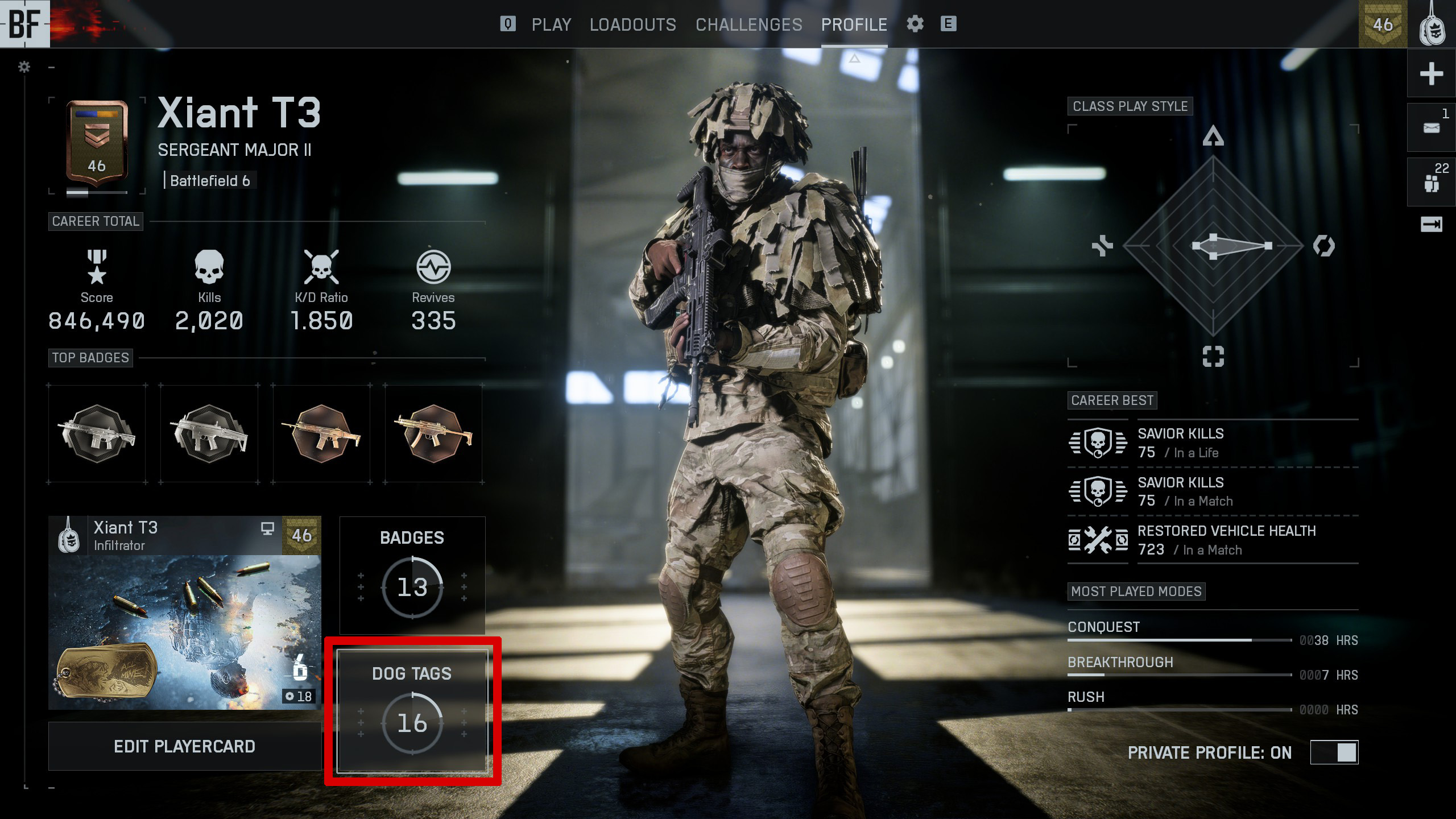 Чтобы проверить, насколько вы продвинулись в получении жетонов Dog Tags, откройте свой Профиль и нажмите на опцию Dog Tags в левом нижнем углу экрана.